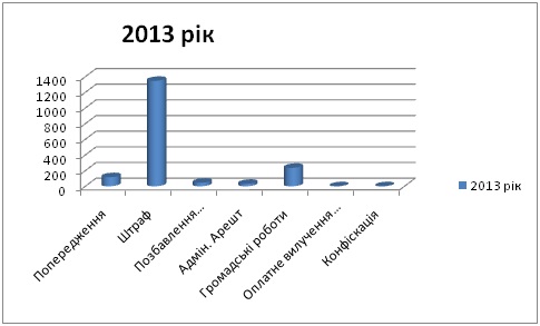 Разом з тим у 2013 році до 144 (2012 р. – до 83 осіб) особи було накладено додаткове адмінстягнення у вигляді конфіскації предмета, а застосування додаткового стягнення у виді оплатного вилучення транспортного засобу у І півріччі 2013 року не було.