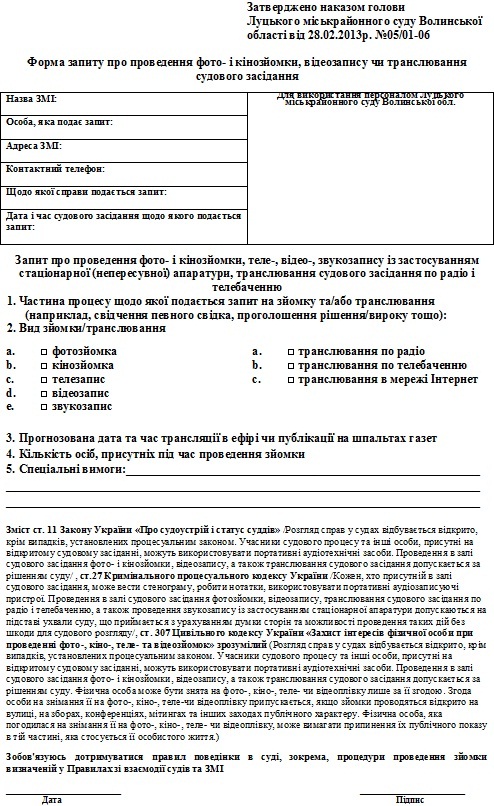 Форма запиту про проведення фото- і кінозйомки, відеозапису чи транслювання судового засідання