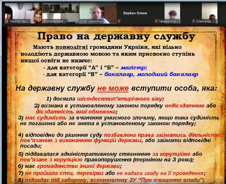 Під час навчання було опрацьовано такі теми: реалізація законодавства в сфері державної служби; запобігання корупції у сфері публічного управління; етика і доброчесність на державній службі; управління змінами; управління конфліктами у професійній діяльності.