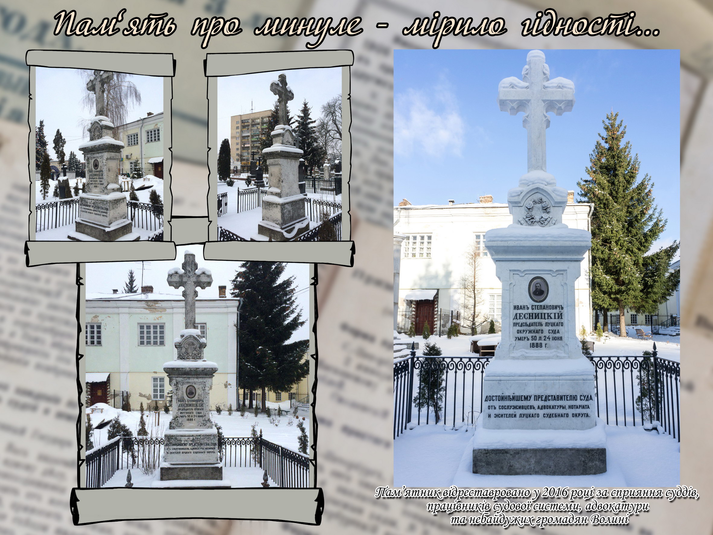 Благословив урочистості Митрополит Луцький і Волинський Михаїл, який відзначив внесок суддівської спільноти та небайдужих громадян області у відновлення пам’ятника голові Луцького Окружного суду Івана Десницького, який помер у 1888 році та похований на території Свято-Троїцького собору у місті Луцьку, що саме по собі вже є великою рідкістю. Адже поблизу найбільших церков, як правило, знаходять вічний спочинок тільки єпископи або дуже відомі люди. «Священик лікує душу, лікар — тіло, а суддя рятує долю», - резюмував роль суду Владика Михаїл.