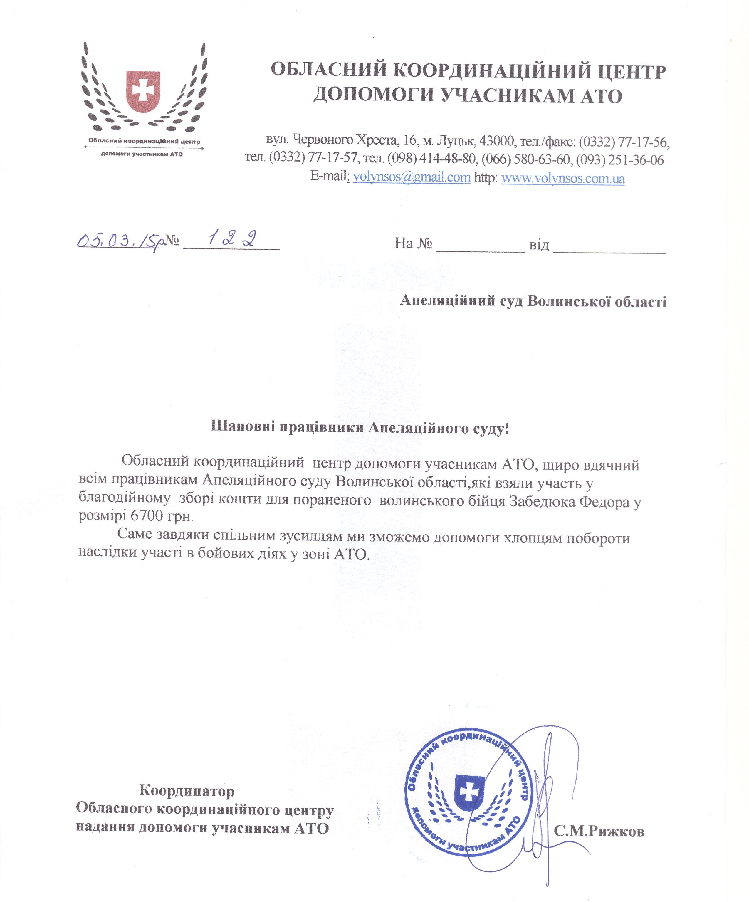 Колективом апеляційного суду Волинської області вкотре надану допомогу