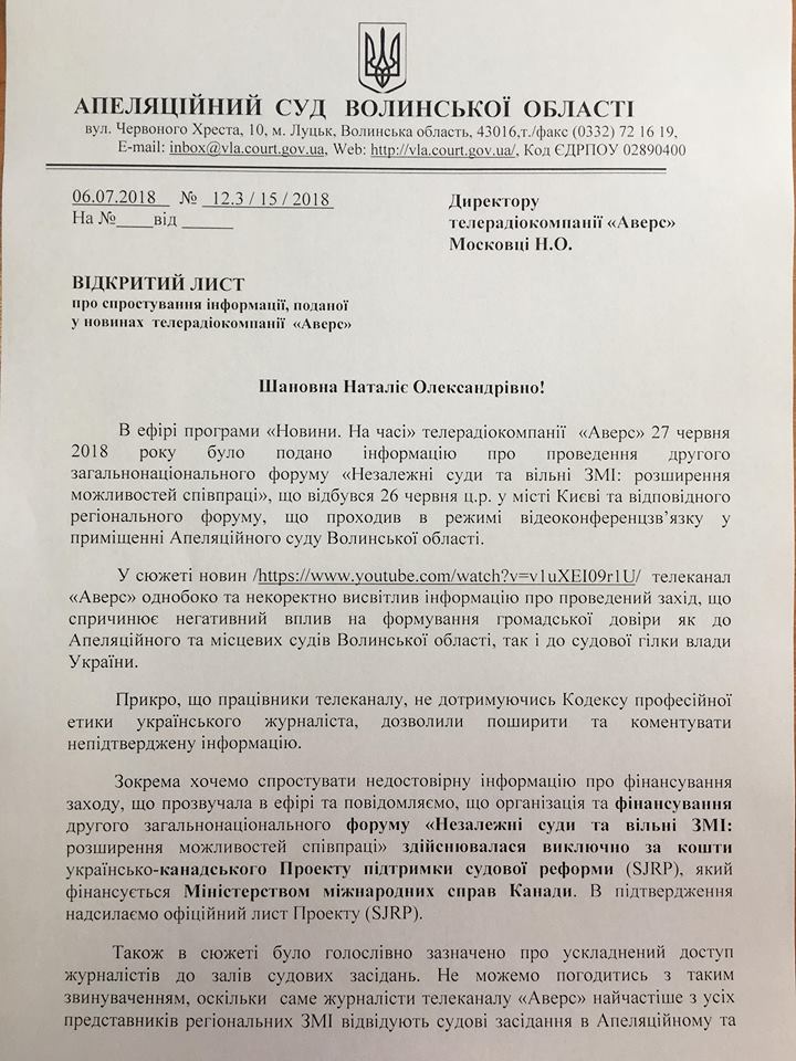 З листом-підтвердженням канадсько-українського Проекту підтримки судової реформи (SJRP) можна ознайомитись ТУТ