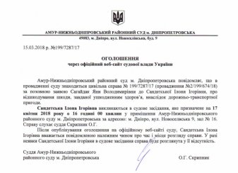 Виклик відповідача Сандетської І.І. по цивільній справі №199/7287/17 за позовом Сагайдак Я.В.(суддя Скрипник О.Г.)