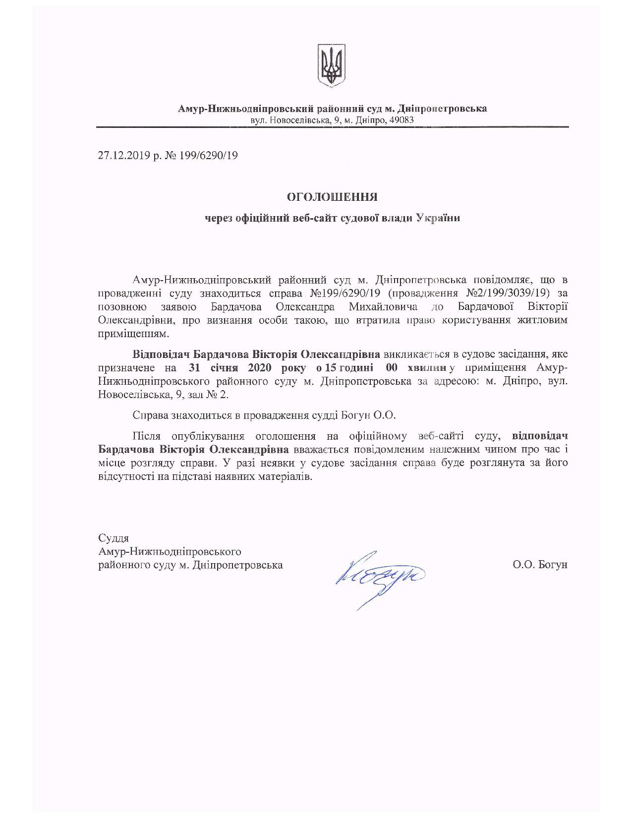 Виклик відповідача Бардачова В.О. по цивільній справі №199/3039/19 за позовом Бардачова О.М.(суддя Богун О.О.)