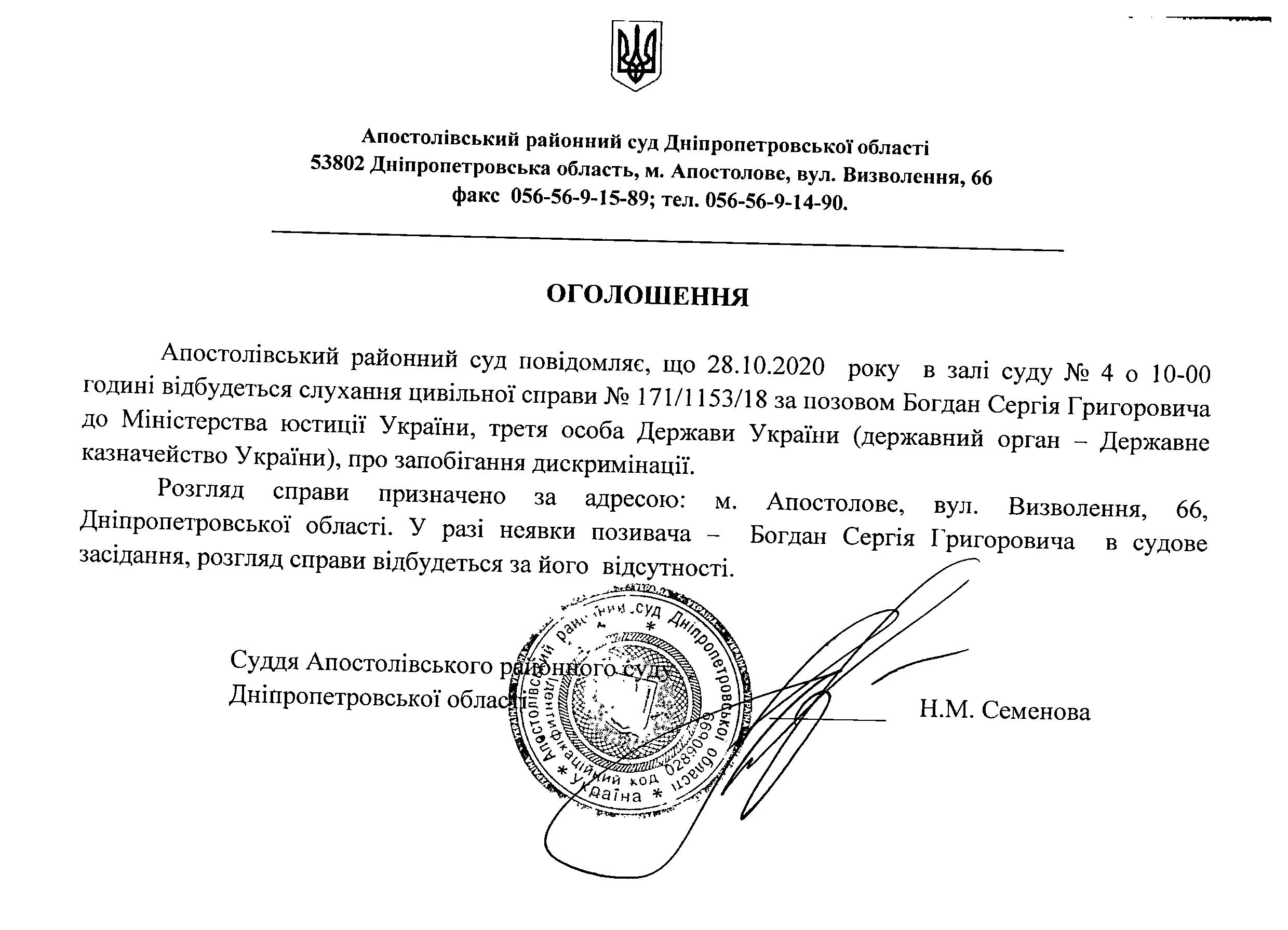 Оголошення про виклик до суду Богдан Сергія Григоровича