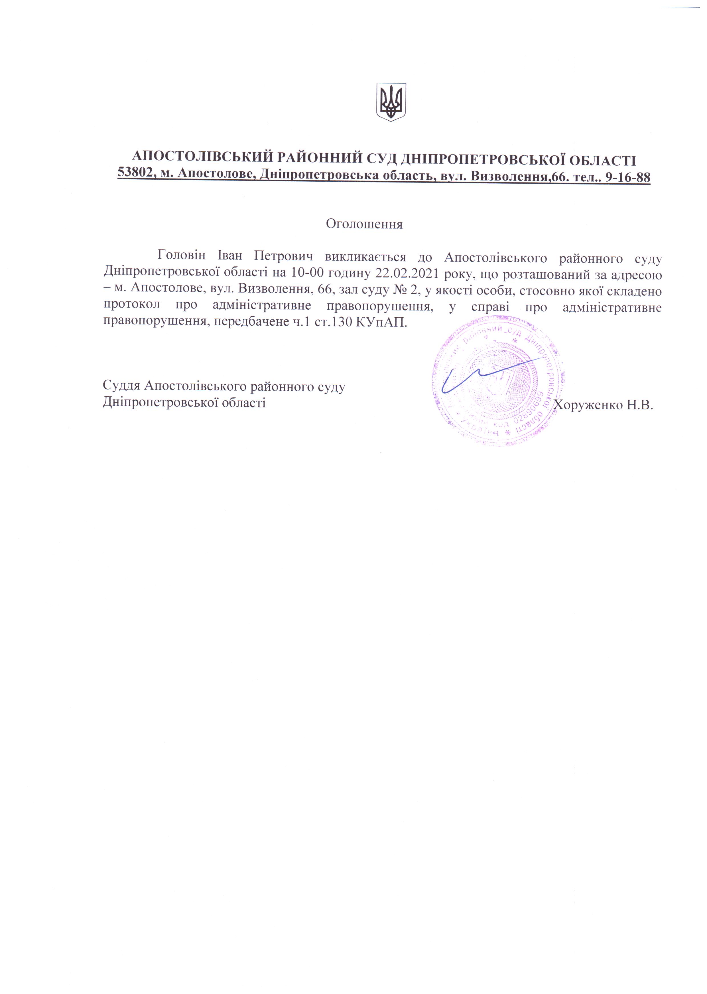 Оголошення про виклик до суду Головіна Івана Петровича