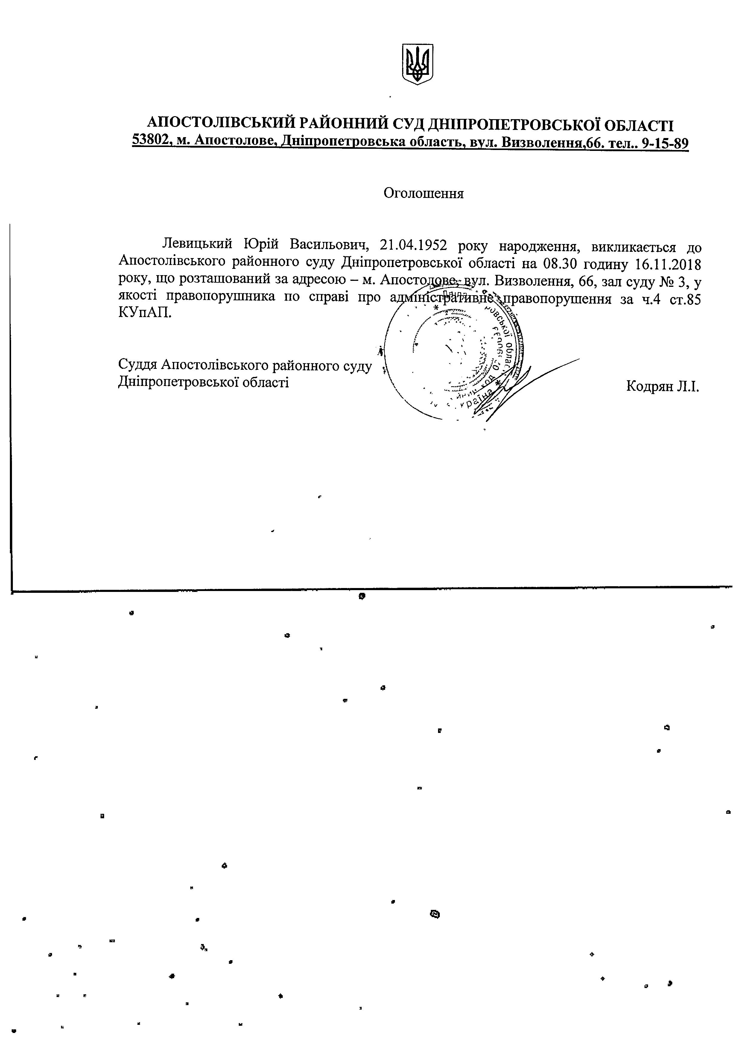 Оголошення про виклик до суду Левицького Юрія Васильовича