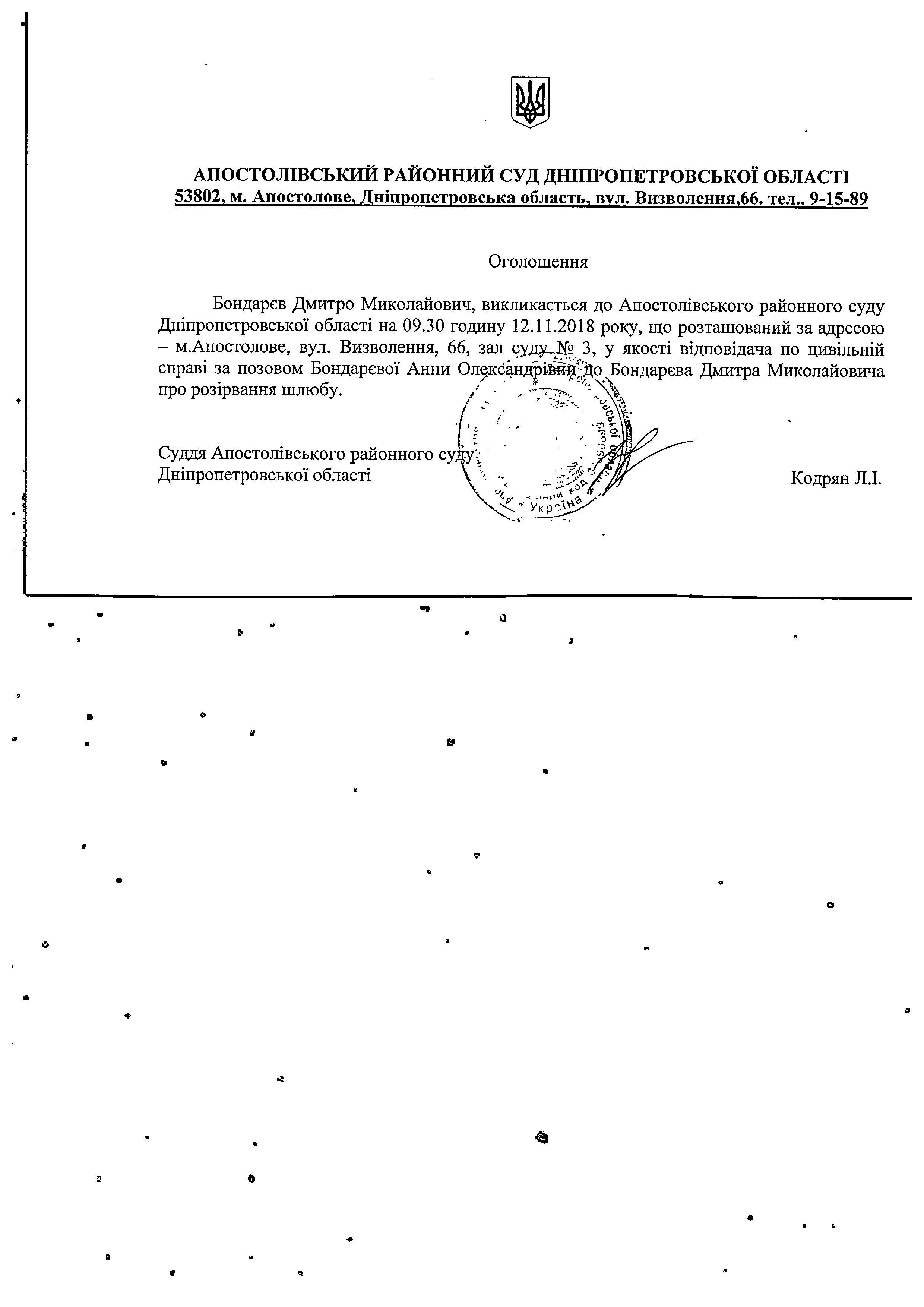 Оголошення про виклик до суду Бондарєва Дмитра Миколайовича