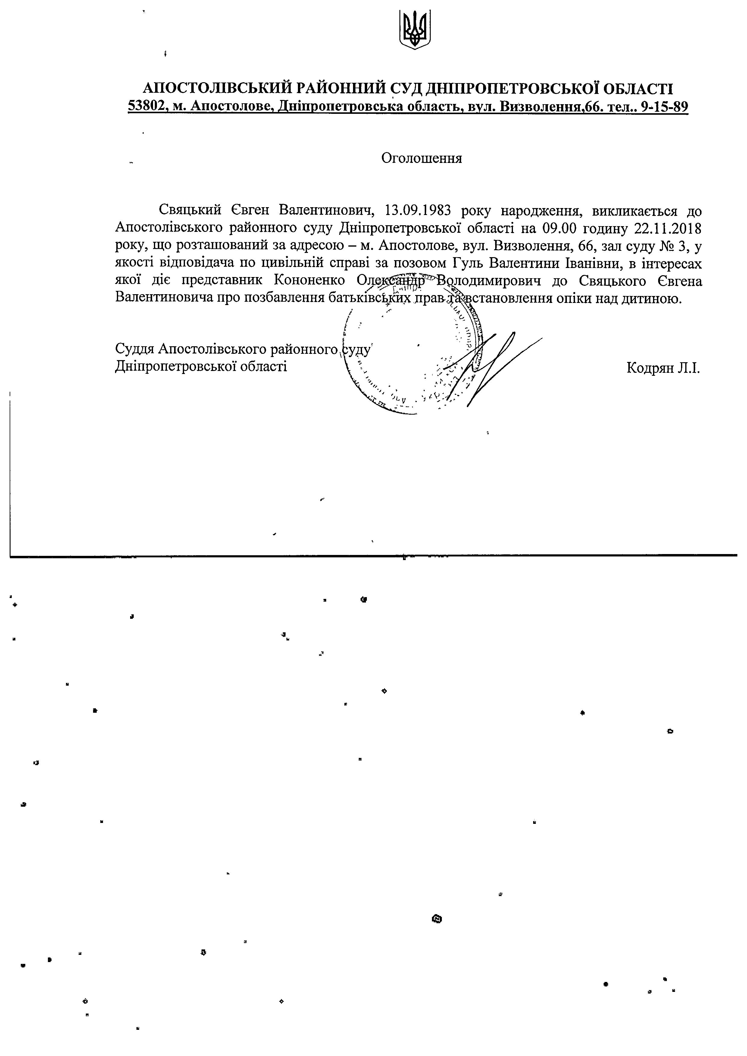 Оголошення про виклик до суду Свяцького Євгена Валентиновича