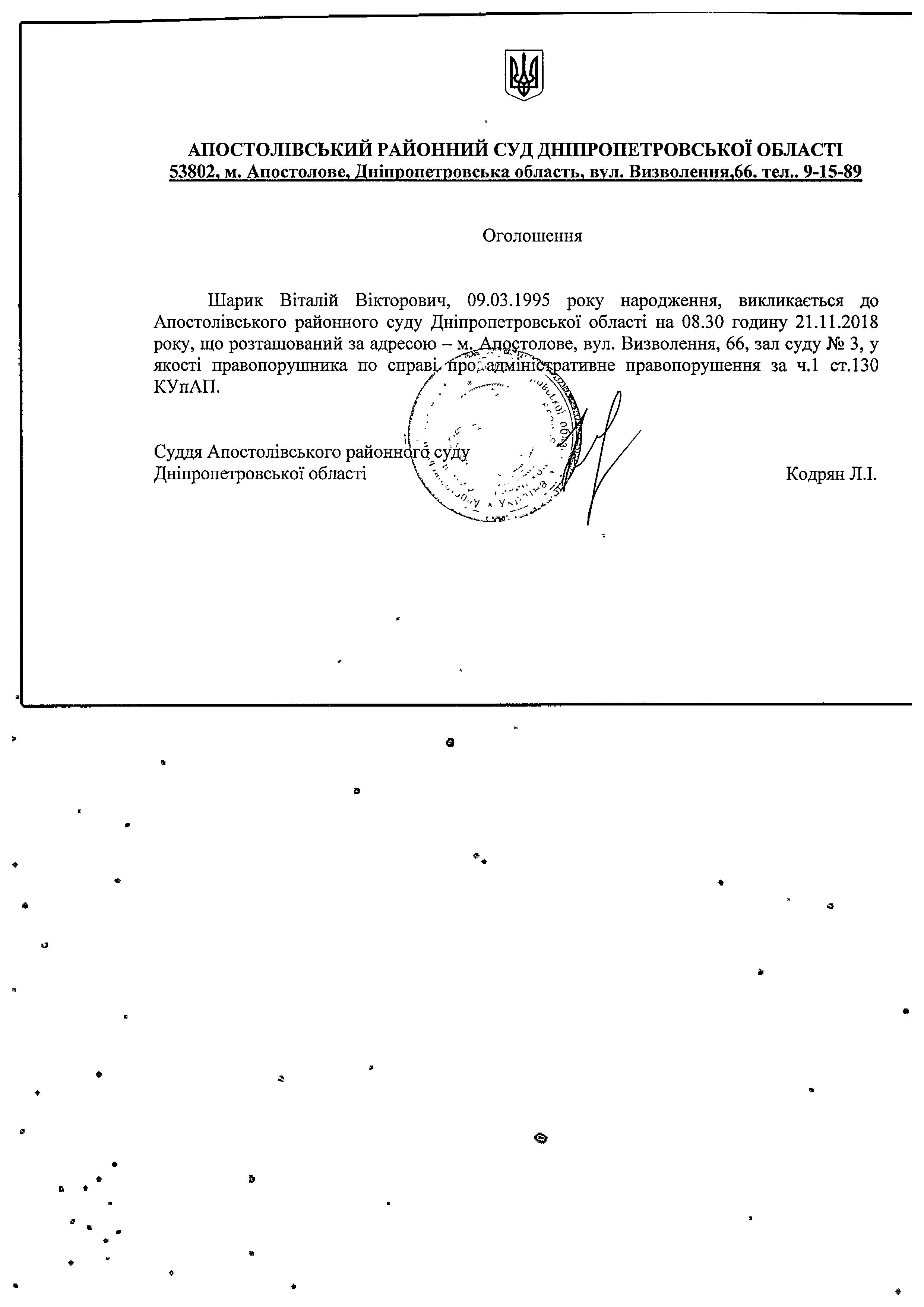 Оголошення про виклик до суду Шарик Віталія Вікторовича