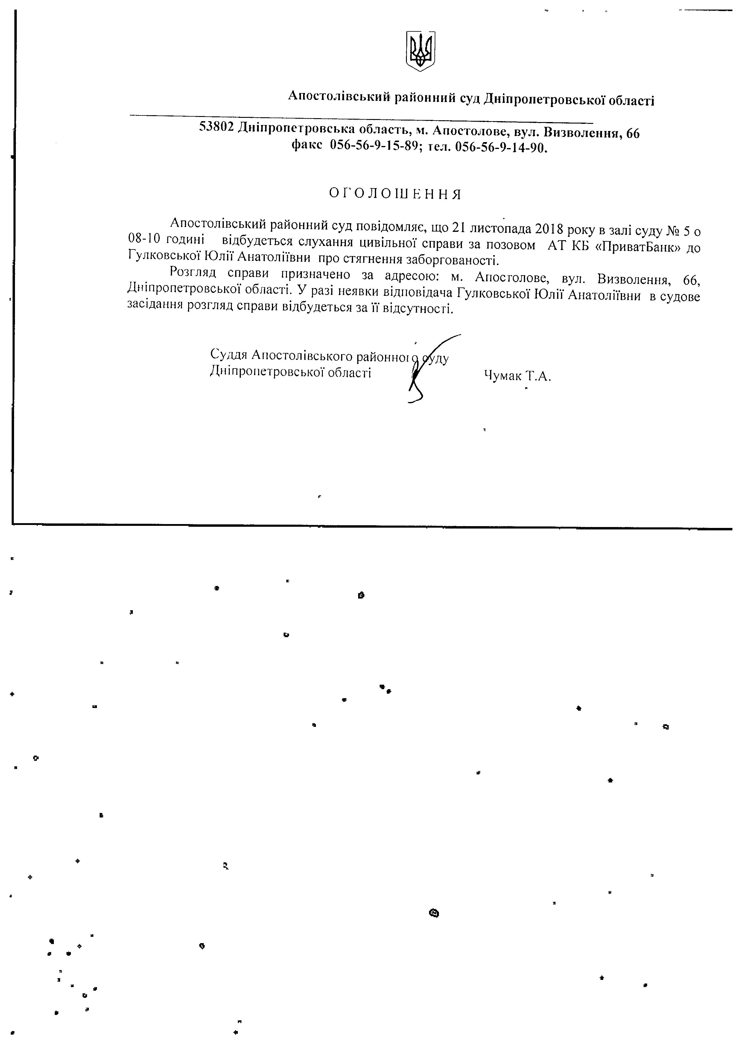 Оголошення про виклик до суду Гулковської Юлії Анатоліївни