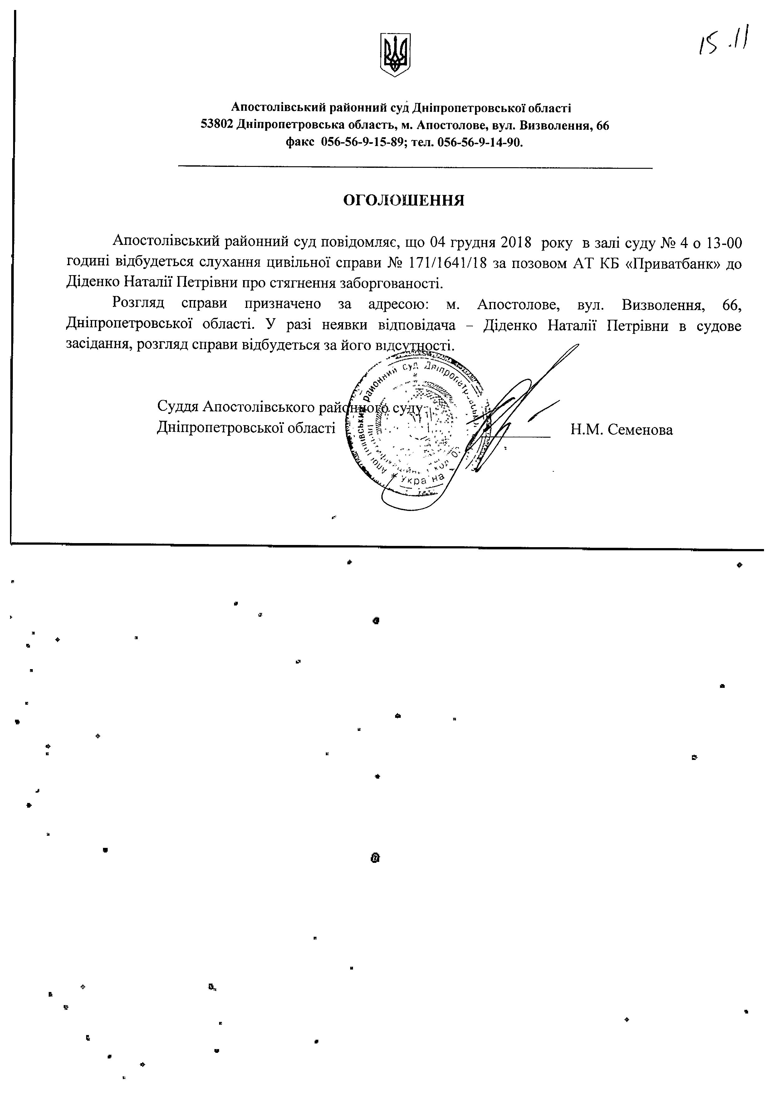 Оголошення про виклик до суду Діденко Наталії Петрівни