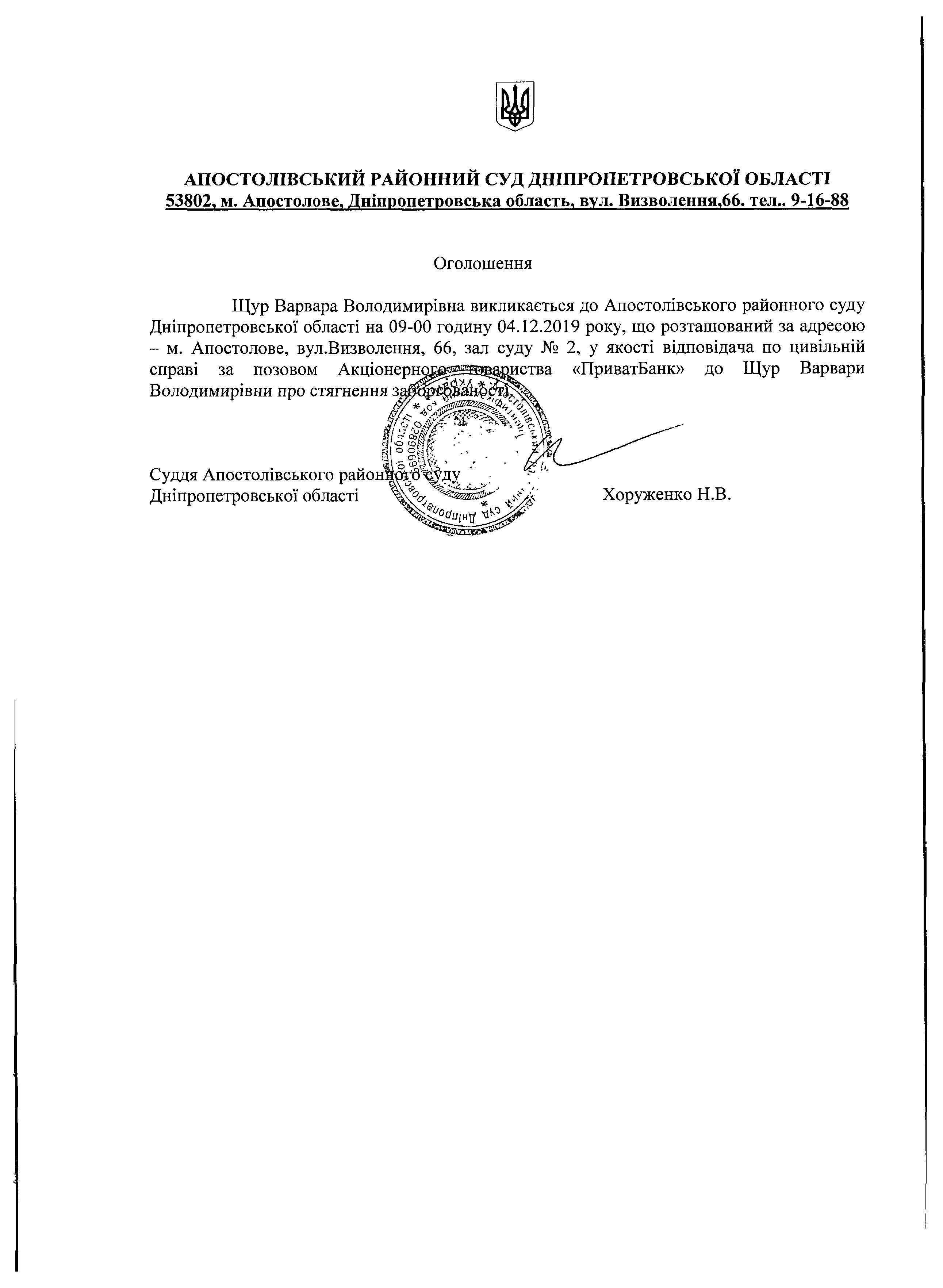 Оголошення про виклик до суду Щур Варвари Володимирівни