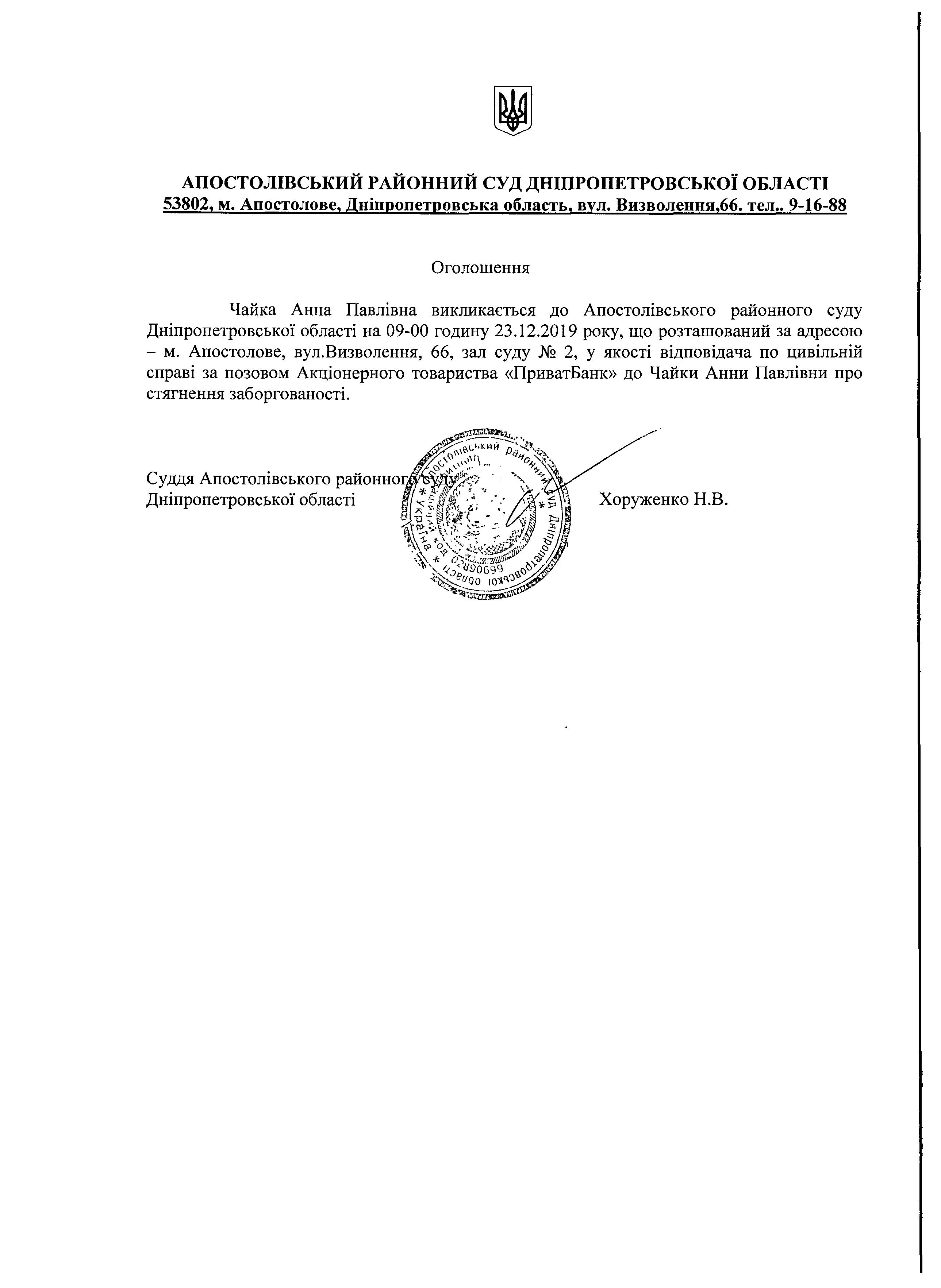 Оголошення про виклик до суду Чайка Анни Павлівни