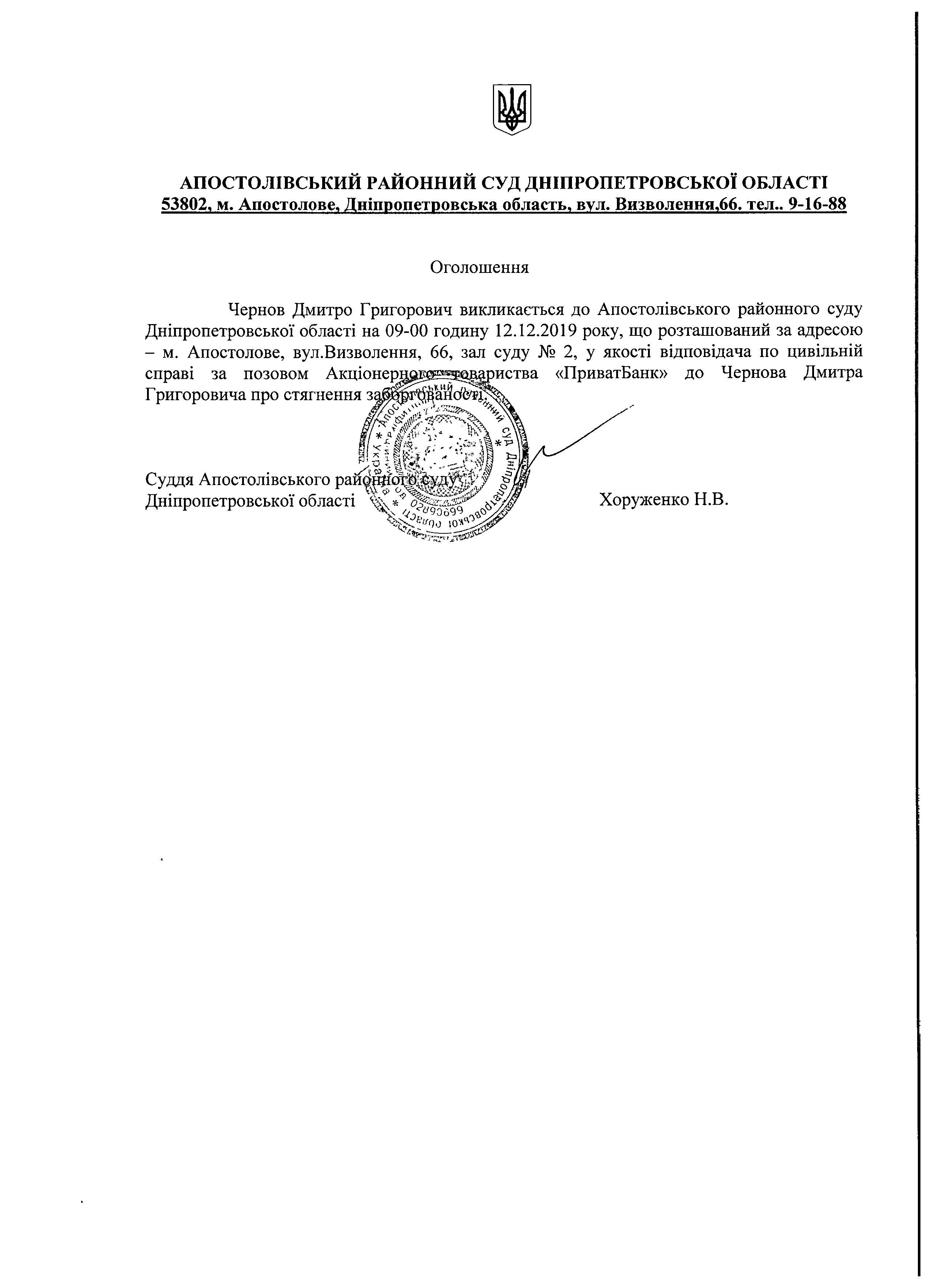 Оголошення про виклик до суду Чернова Дмитра Григоровича