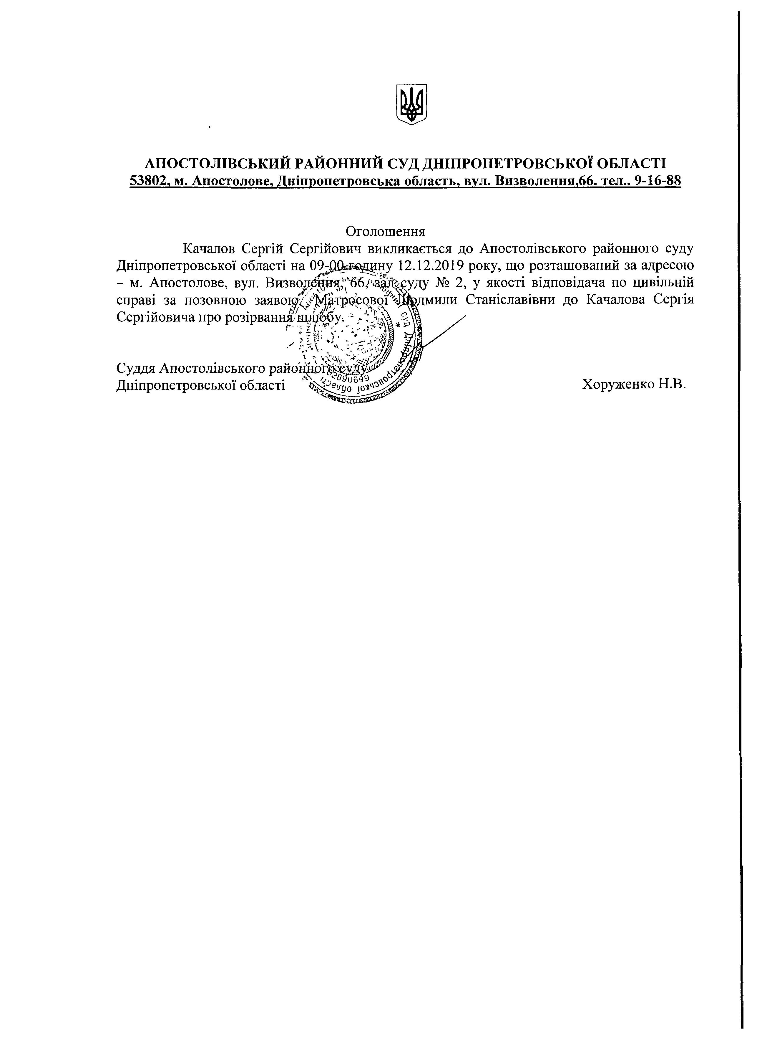 Оголошення про виклик до суду Качалова Сергія Сергійовича