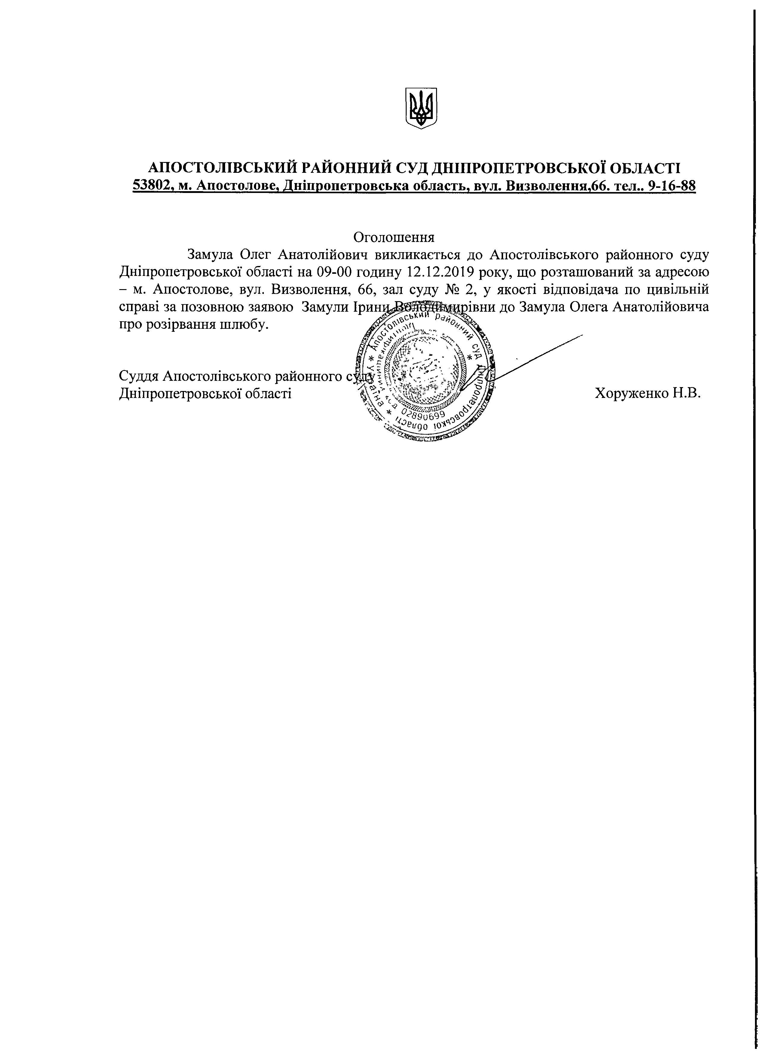 Оголошення про виклик до суду Замула Олега Анатолійовича