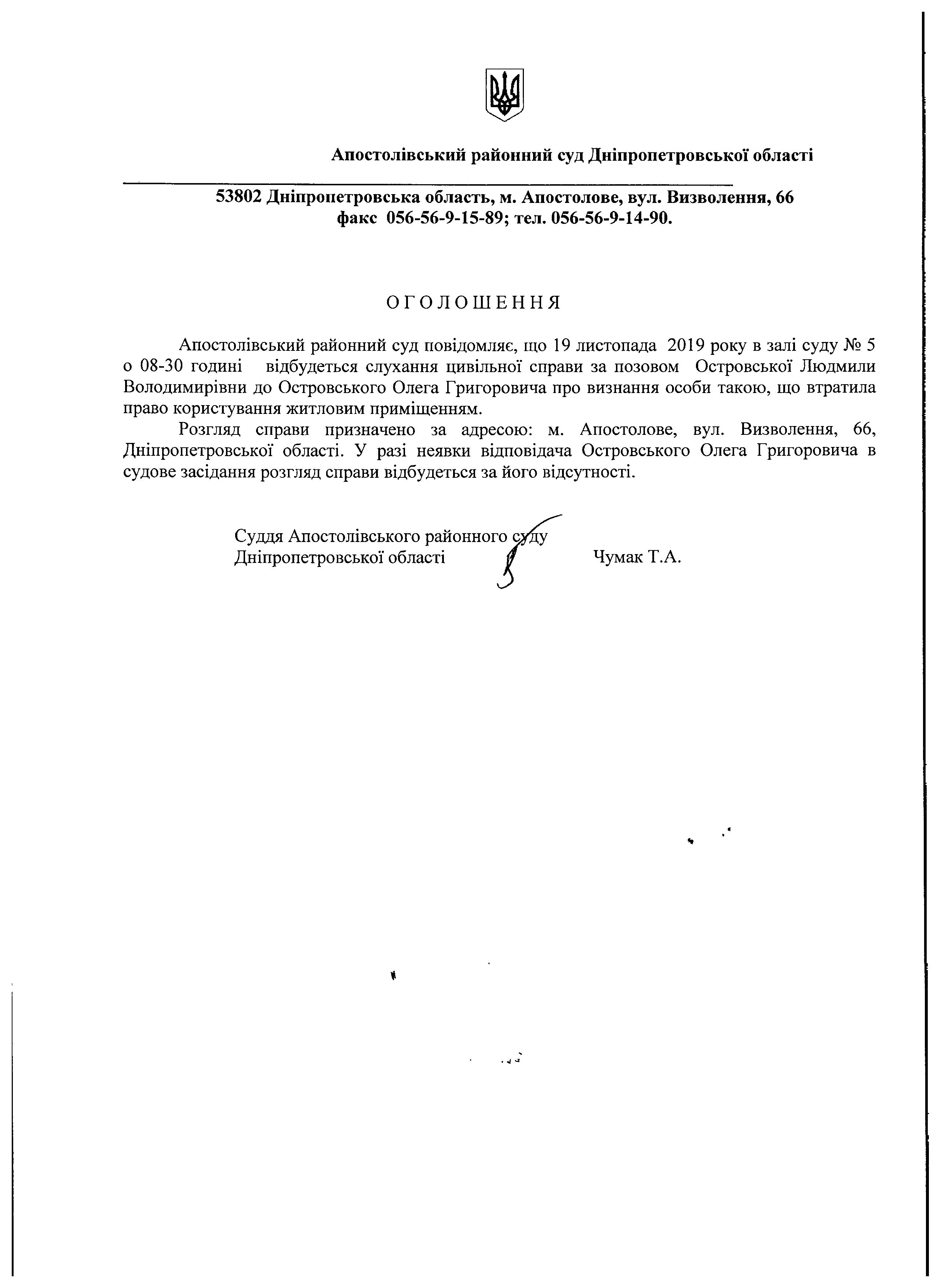 Оголошення про виклик до суду Островського Олега Григоровича