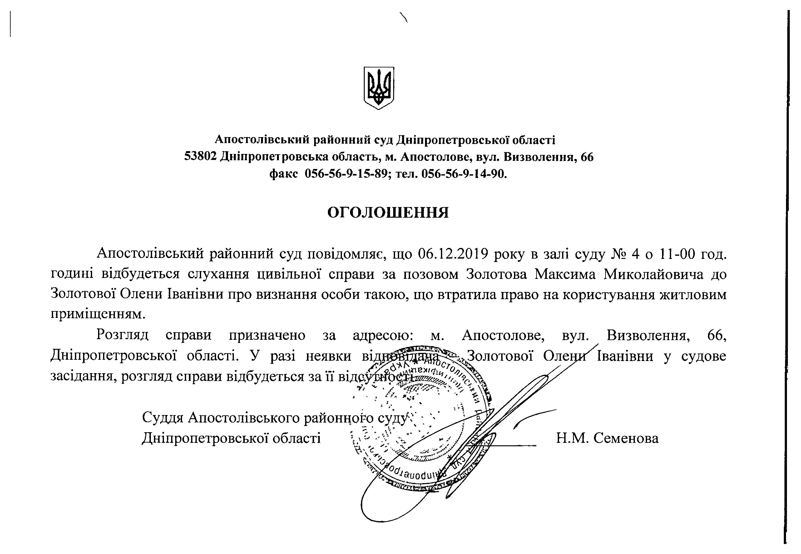 Оголошення про виклик до суду Золотової Олени Іванівни