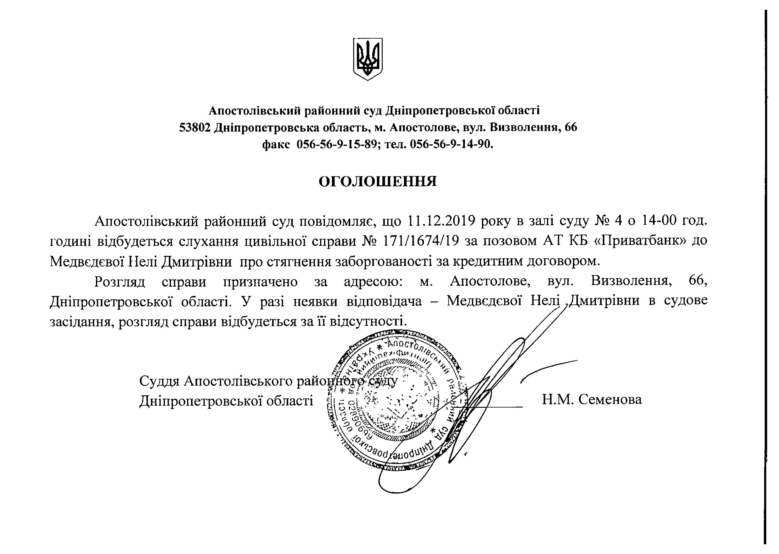 Оголошення про виклик до суду Медвєдєвої Нелі Дмитрівни