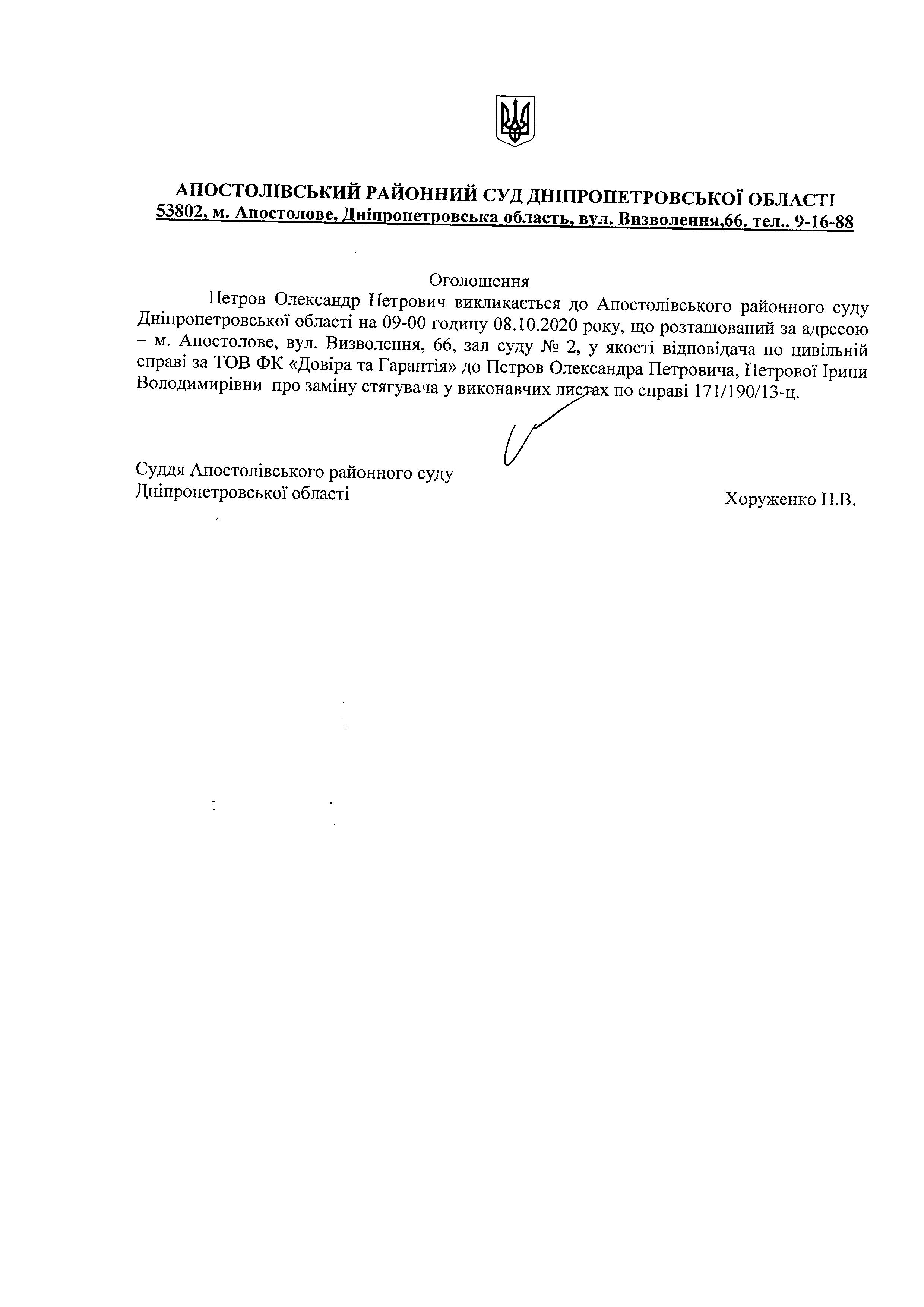 Оголошення про виклик до суду Петрова Олександра Петровича