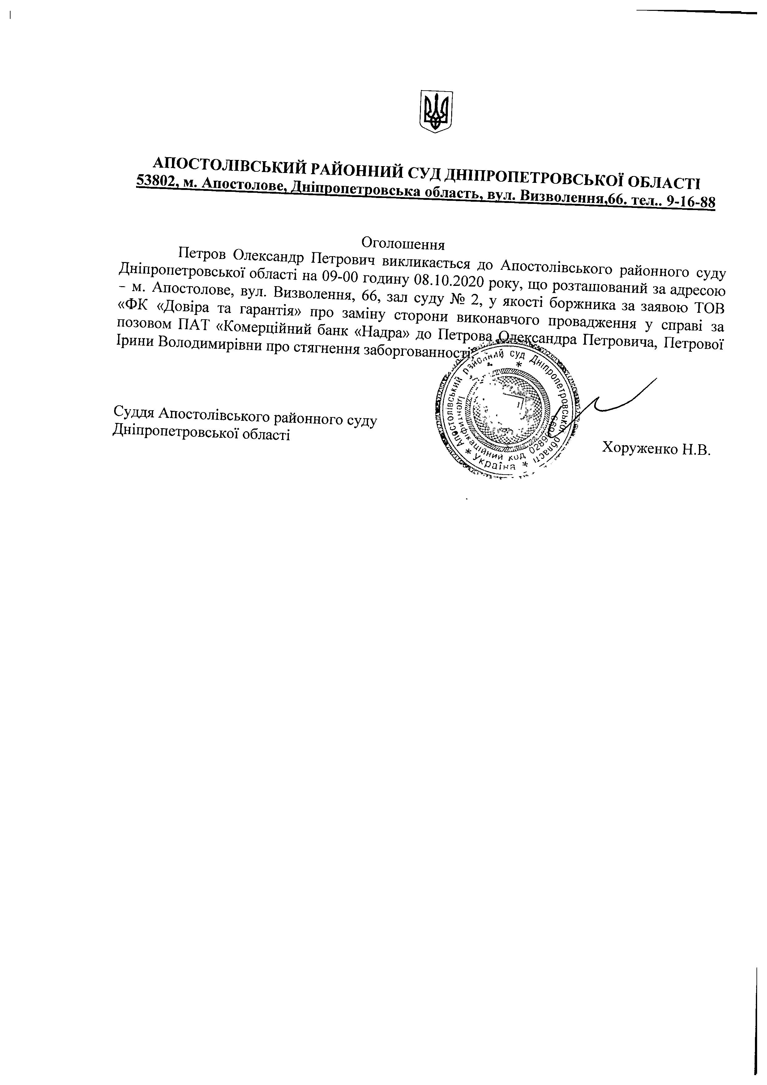Оголошення про виклик до суду Петрова Олександра Петровича