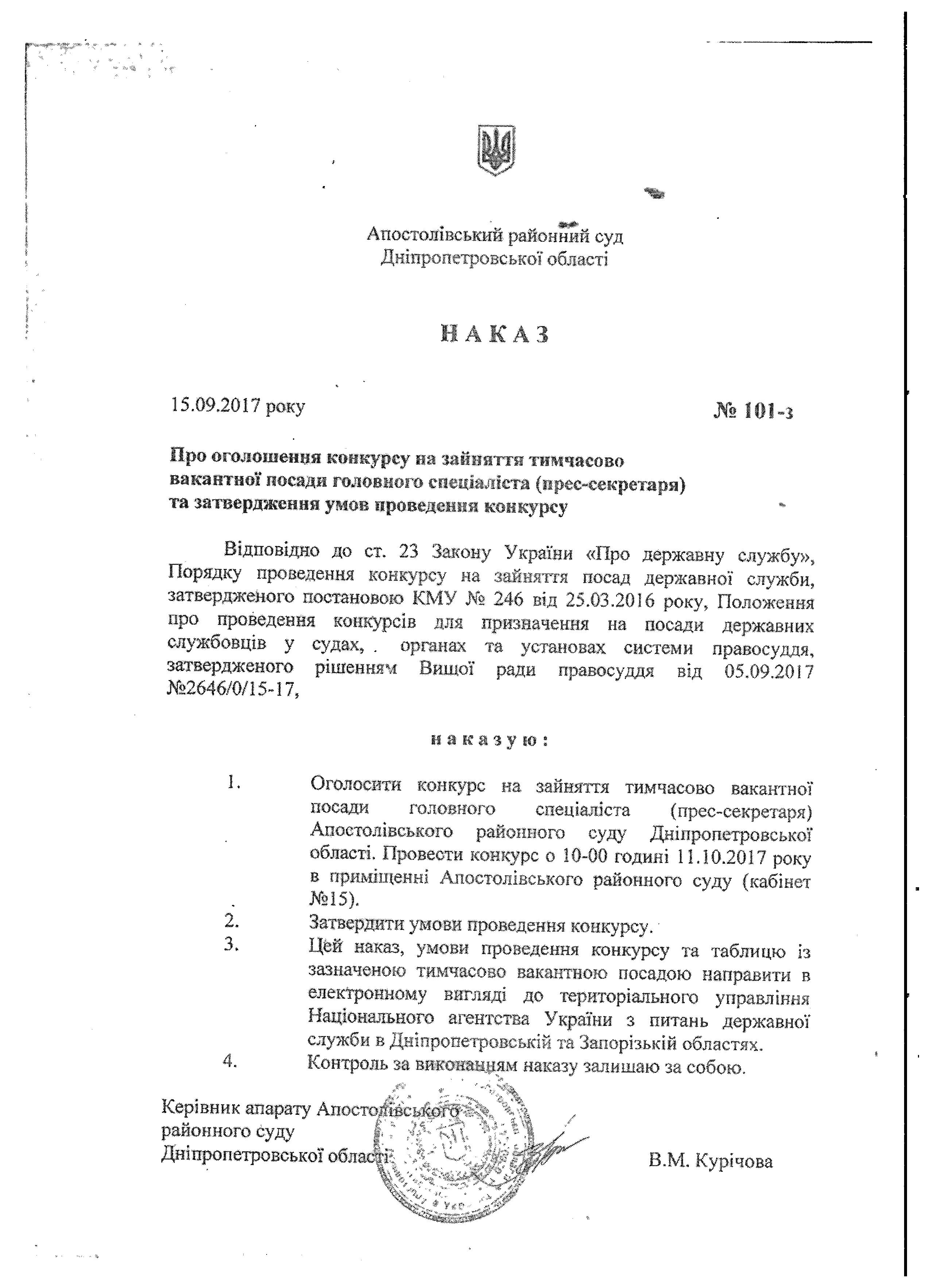 Наказ про оголошення конкурсу на зайняття тимчасово вакантної посади головного спеціаліста (прес-секретаря)