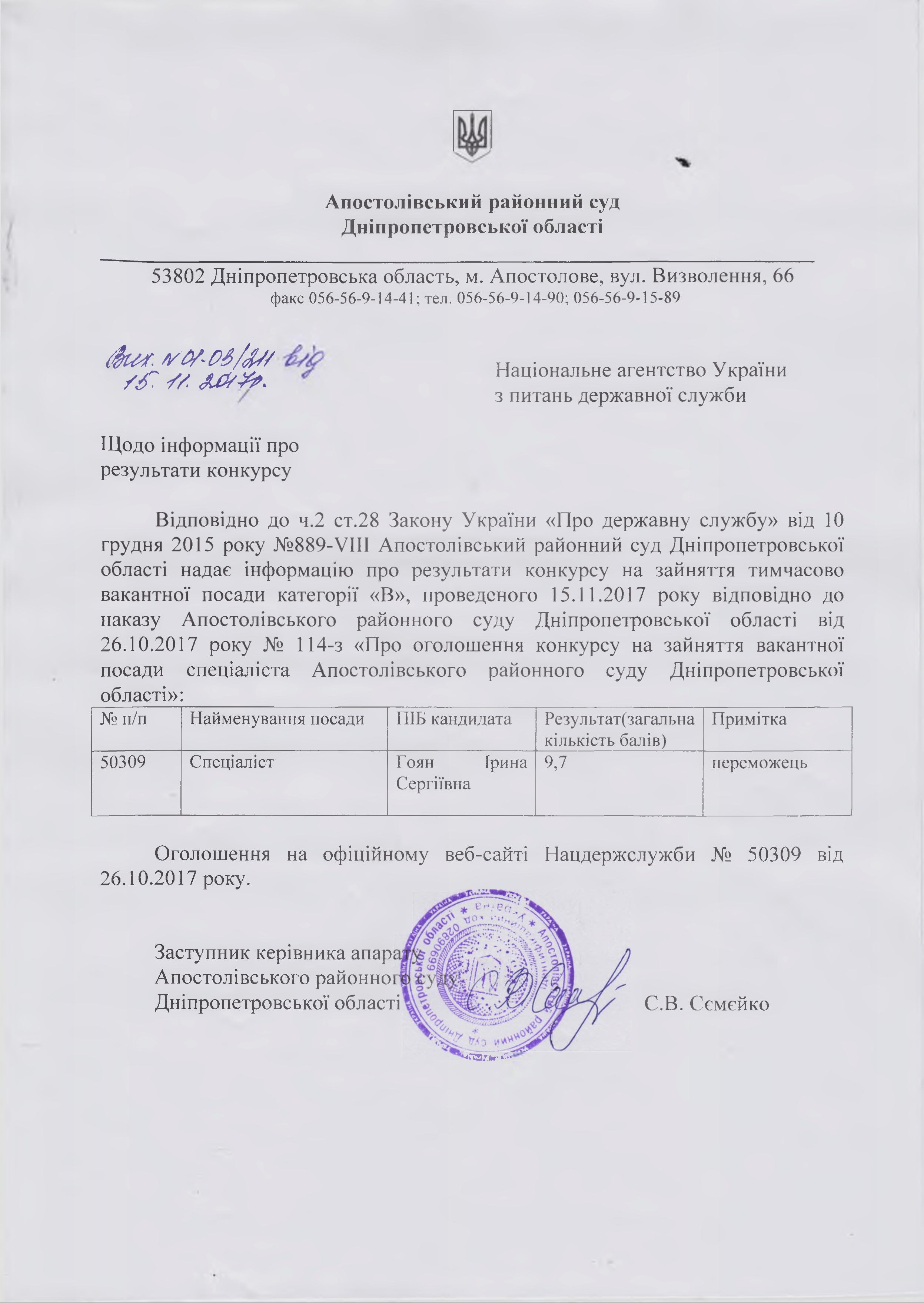 Щодо інформації про результати конкурсу на зайняття вакантної посади спеціаліста Апостолівського районного суду Дніпропетровської області