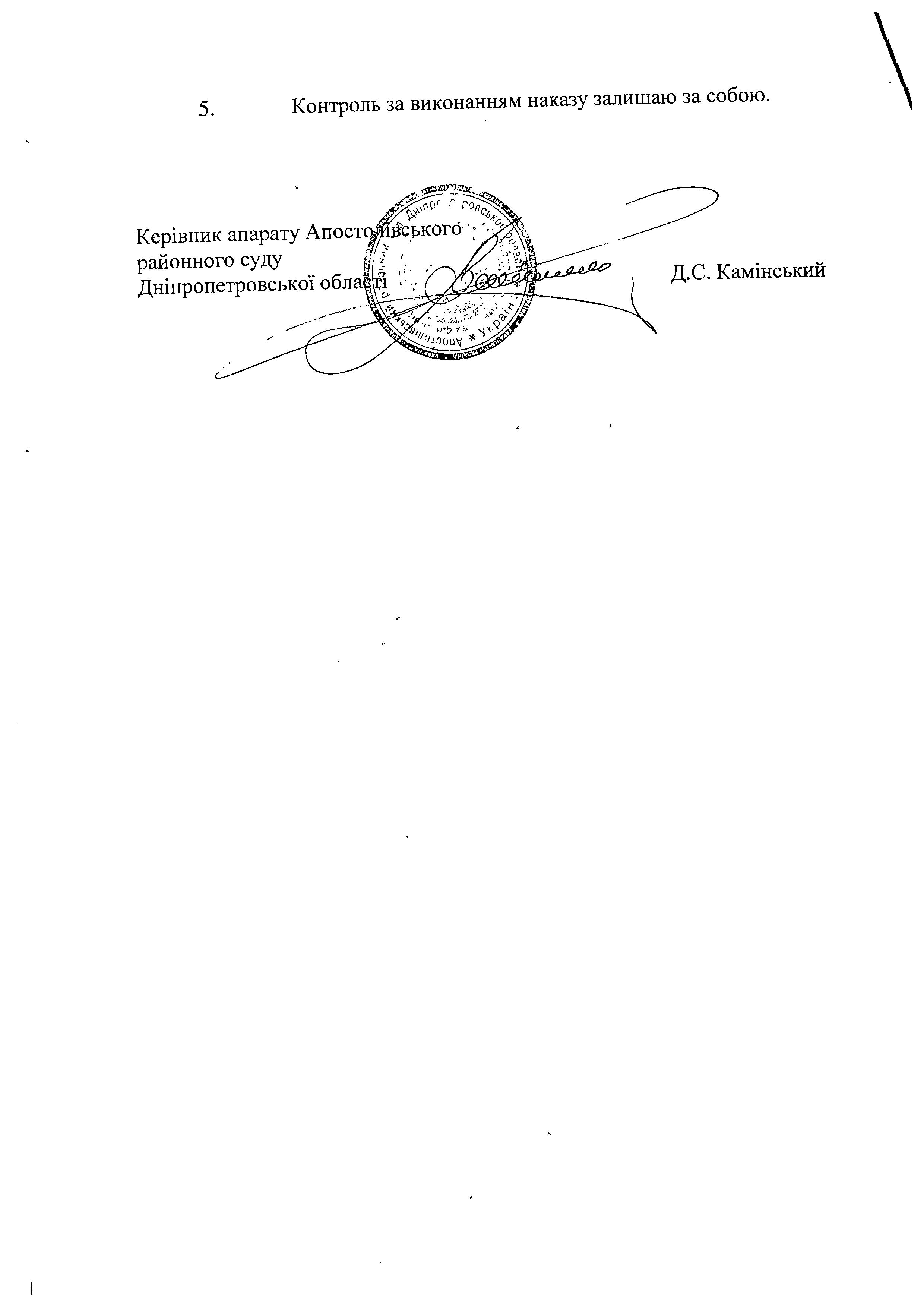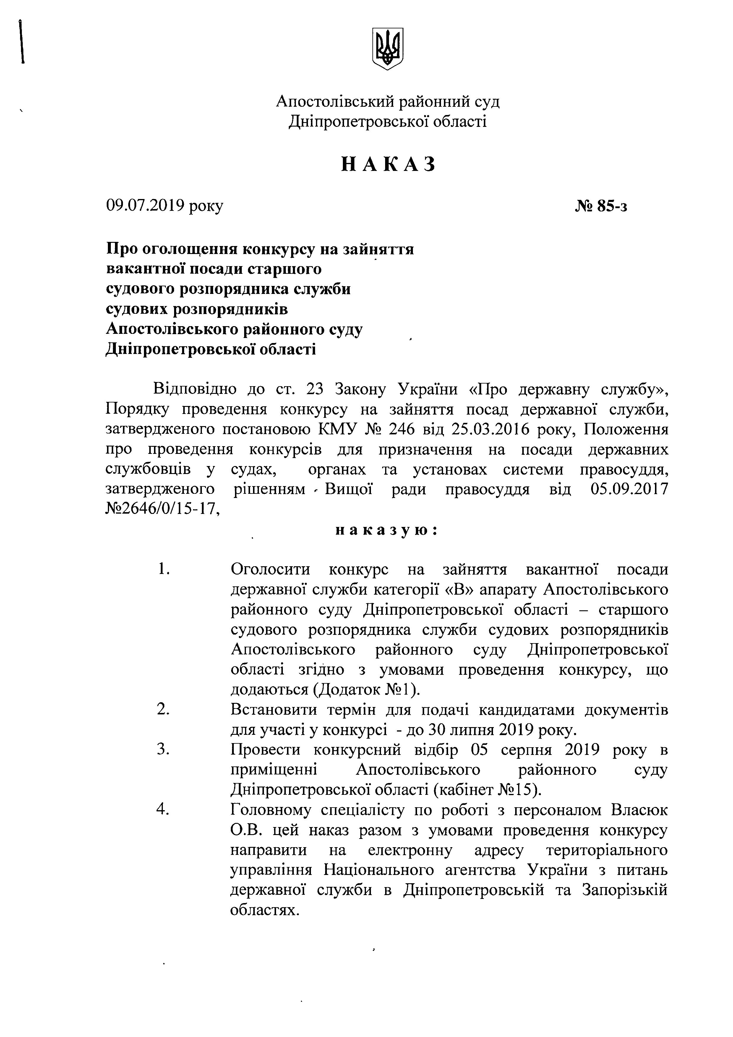 Наказ Про оголошення конкурсу на зайняття вакантної посади старшого судового розпорядника Апостолівського районного суду Дніпропетровської області