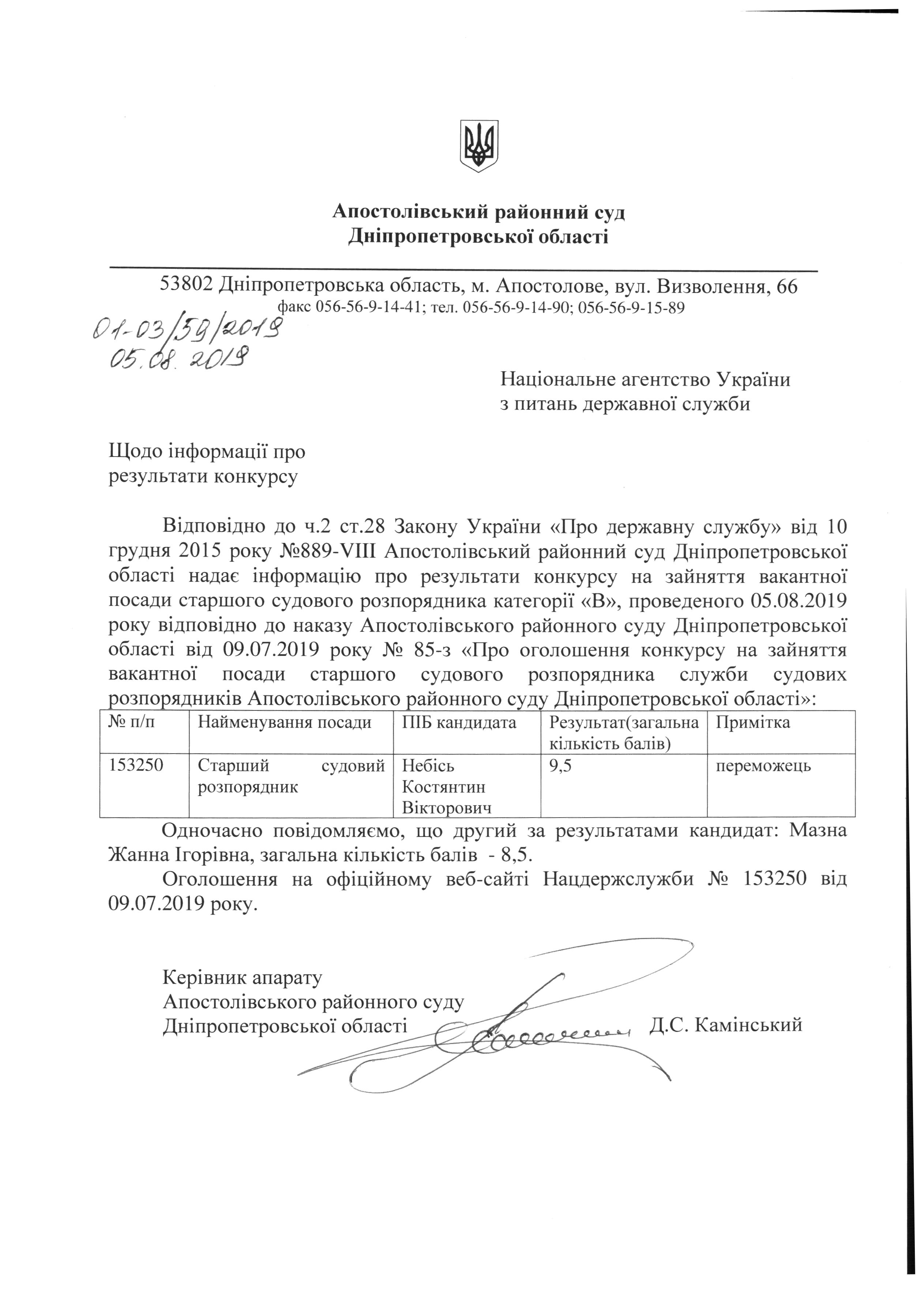 Щодо інформації про результати конкурсу на зайняття вакантної посади старшого судового розпорядника Апостолівського районного суду Дніпропетровської області