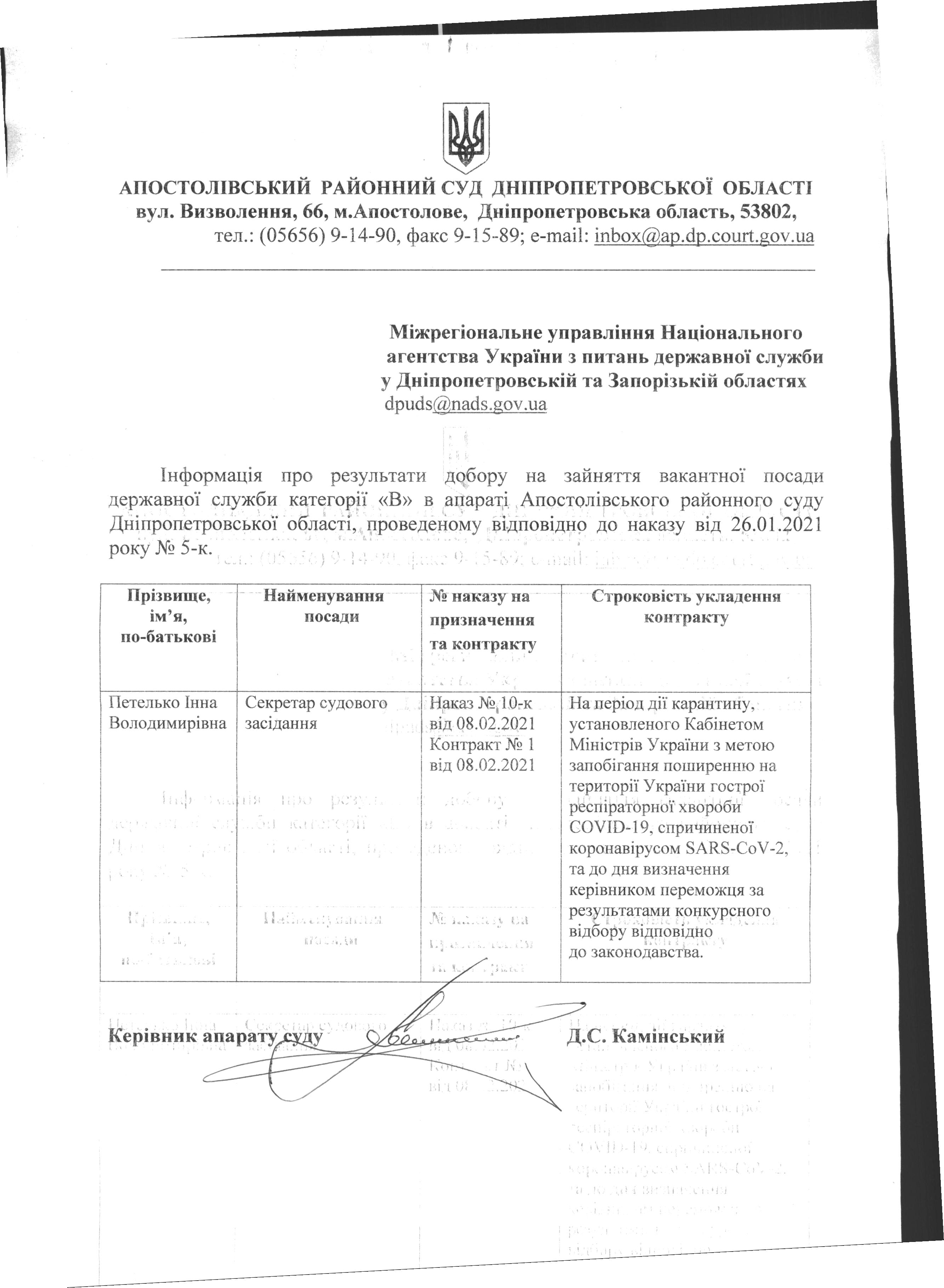 Інформація про результати добору на зайняття вакантної посади державної служби категорії «В»(секретар судового засідання) в апараті Апостолівського районного суду Дніпропетровської області.