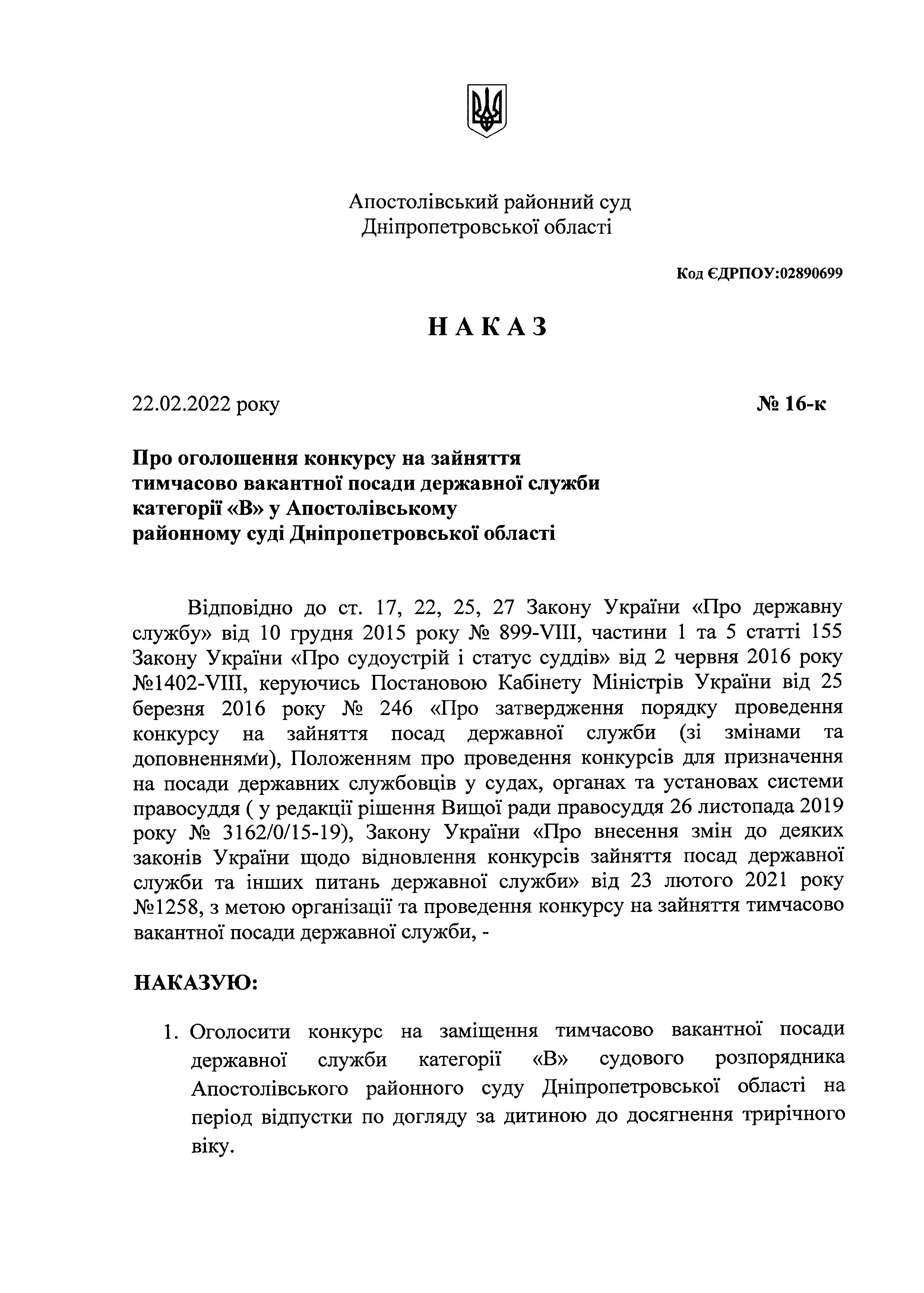 Про оголошення конкурсу на зайняття тимчасово вакантної посади державної служби категорії "В" в Апостолівському районному суді Дніпропетровської області"