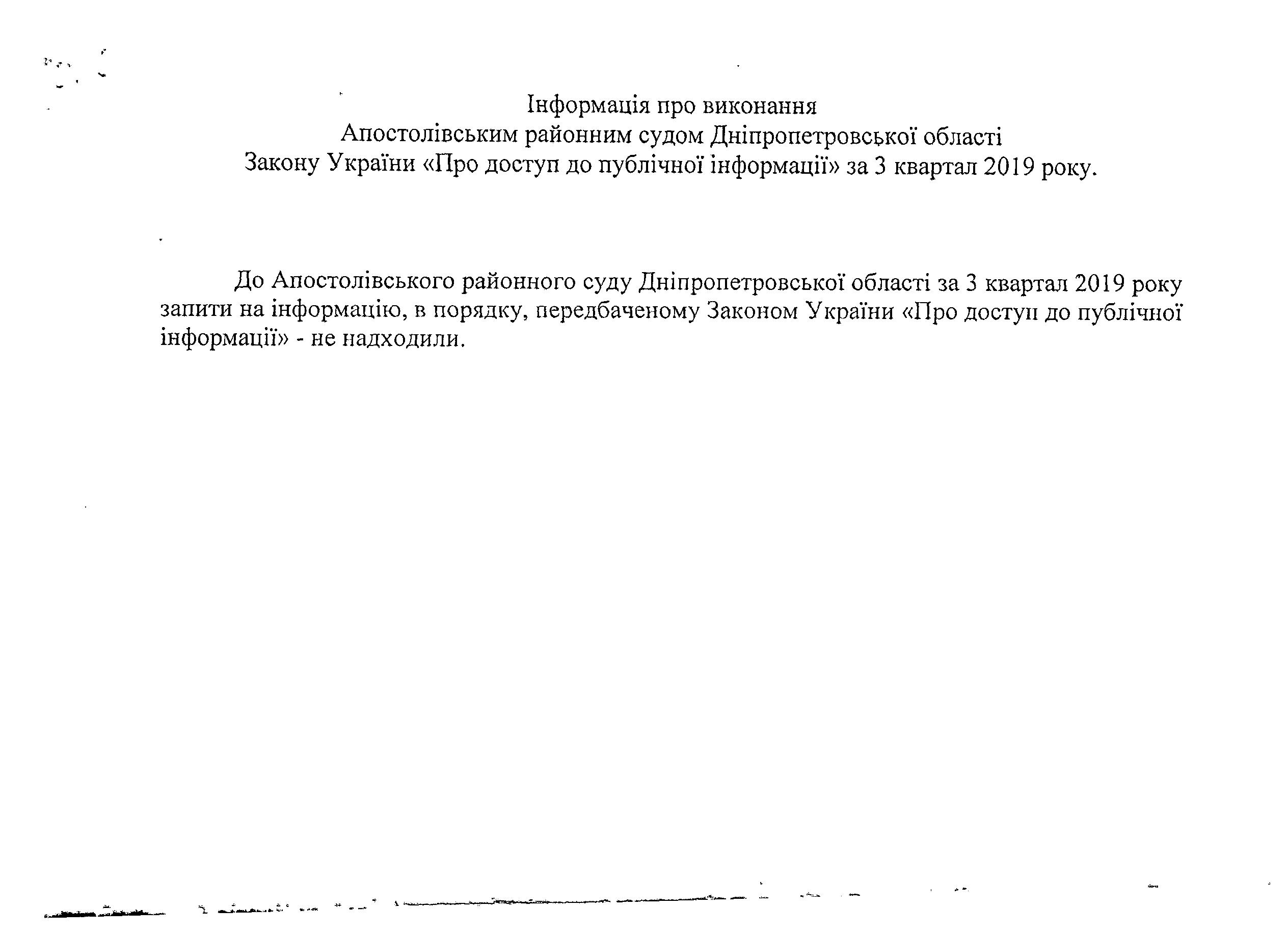 Інформація про виконання Апостолівським районним судом Дніпропетровської області Закон України "Про доступ до публічної інформації" за 3 квартал 2019"