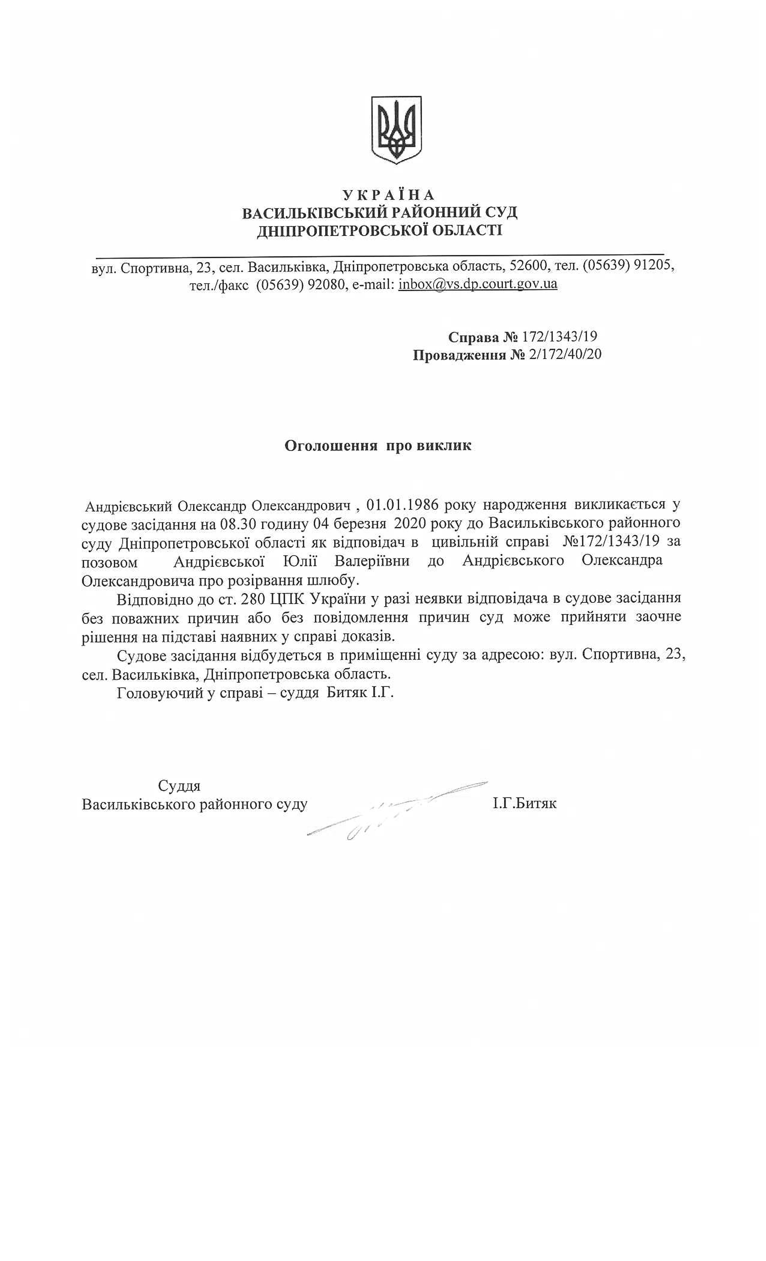 Оголошення про виклик Андрієвський Олександр Олександрович