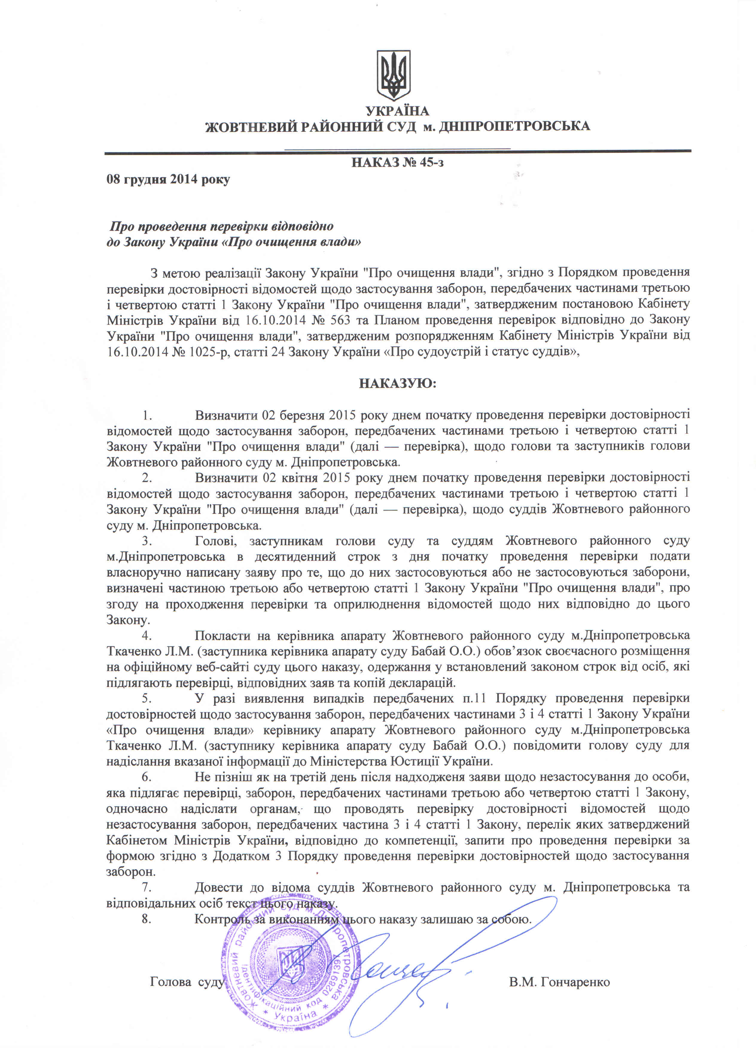 Наказ про проведення перевірки відповідно до Закону України "Про очищення влади"