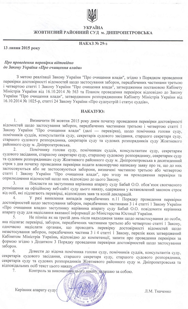Наказ про проведення перевірки відповідно до Закону України "Про очищення влади"