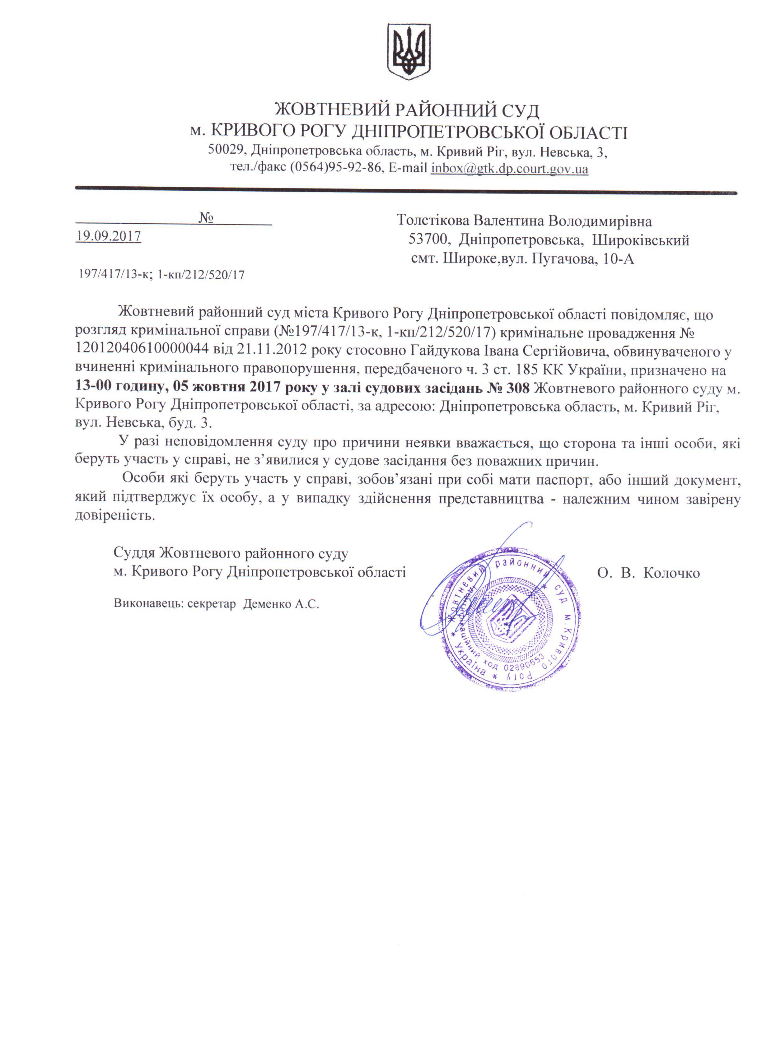 Повідомлення про розгляд кримінальної справи стосовно Гайдукова Івана Сергійовича