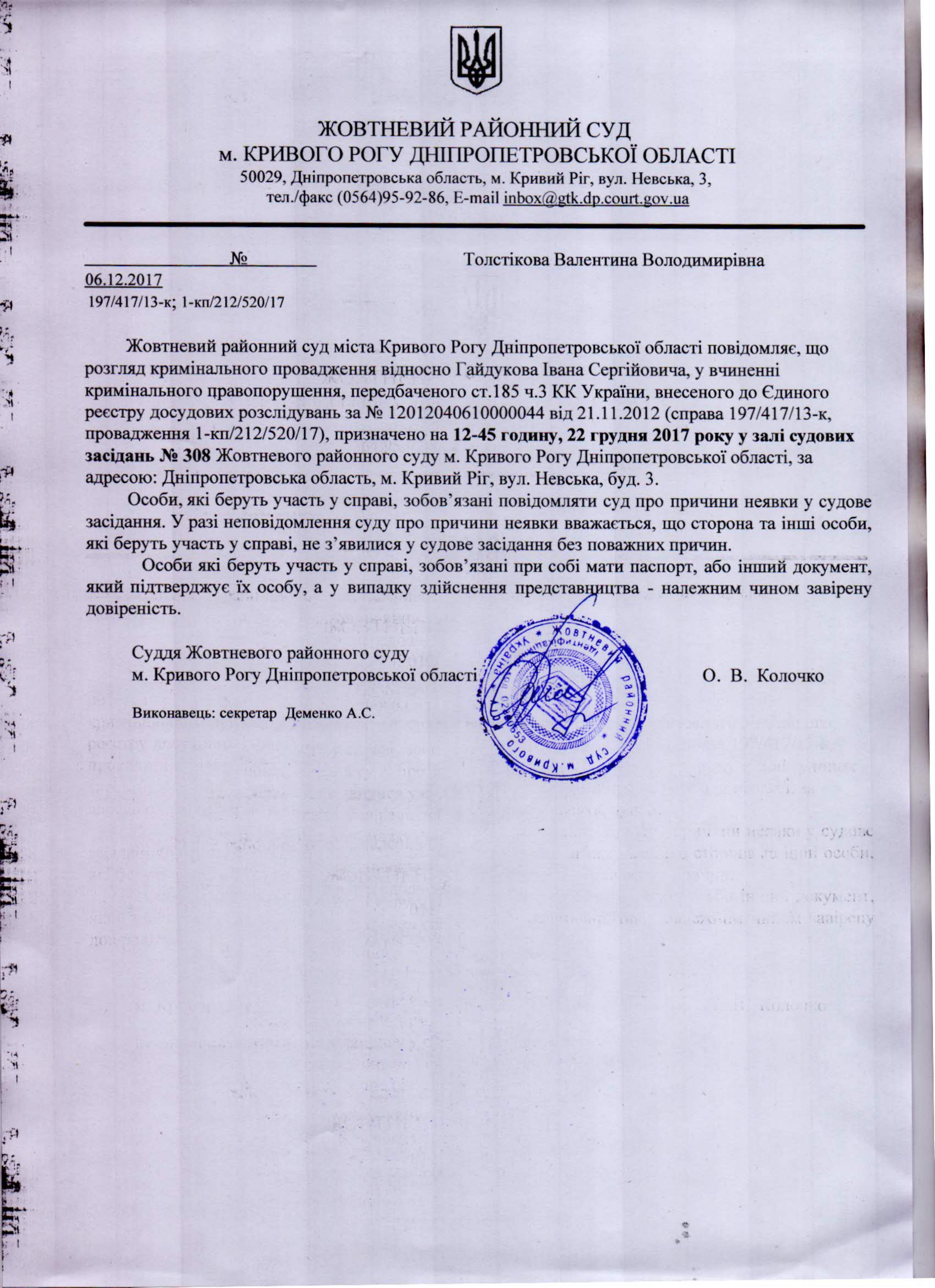 Повідомлення про розгляд кримінальної справи стосовно Гайдукова Івана Сергійовича