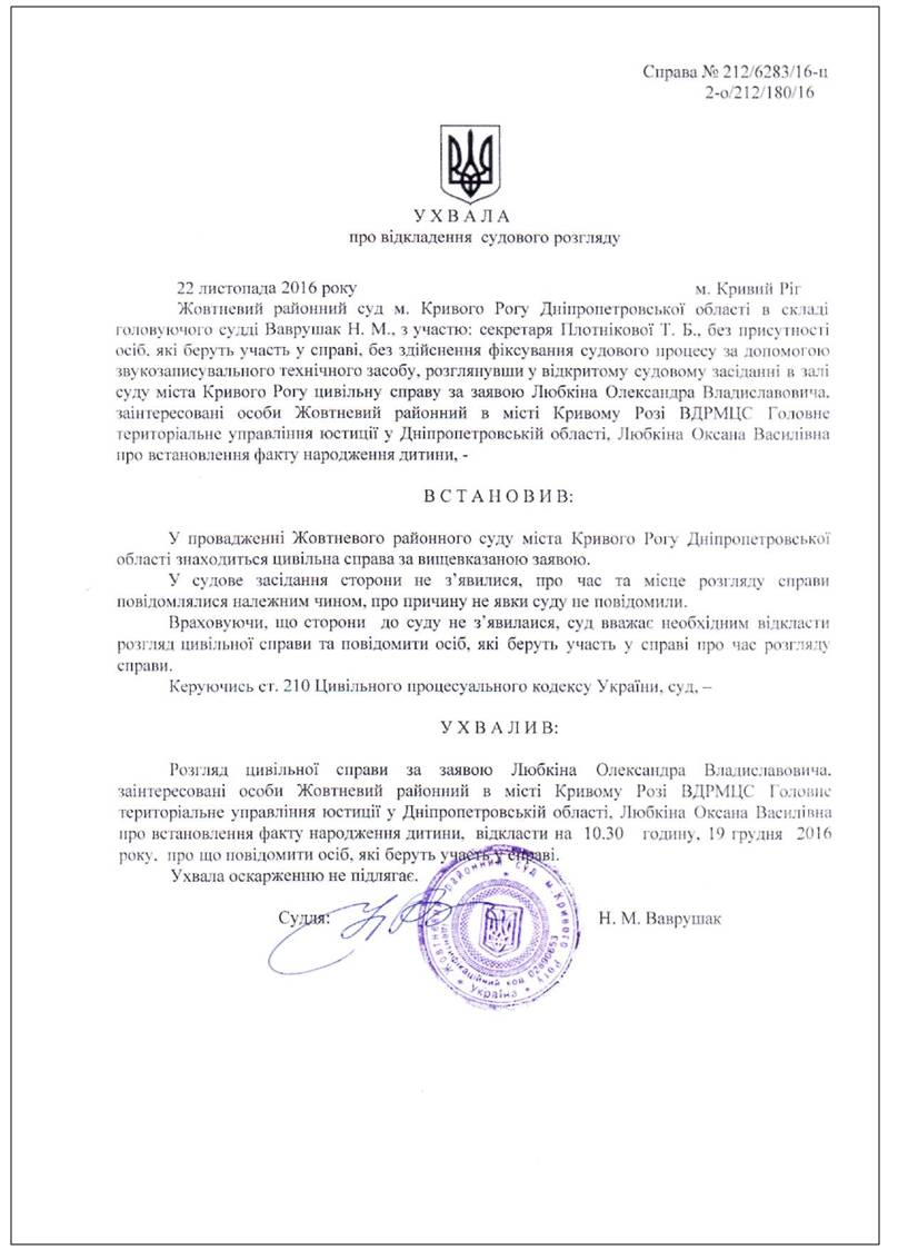 25.11.2016 Повідомлення про відкладення розгляду цивільної справи за заявою Любкіна Олександра Владиславовича