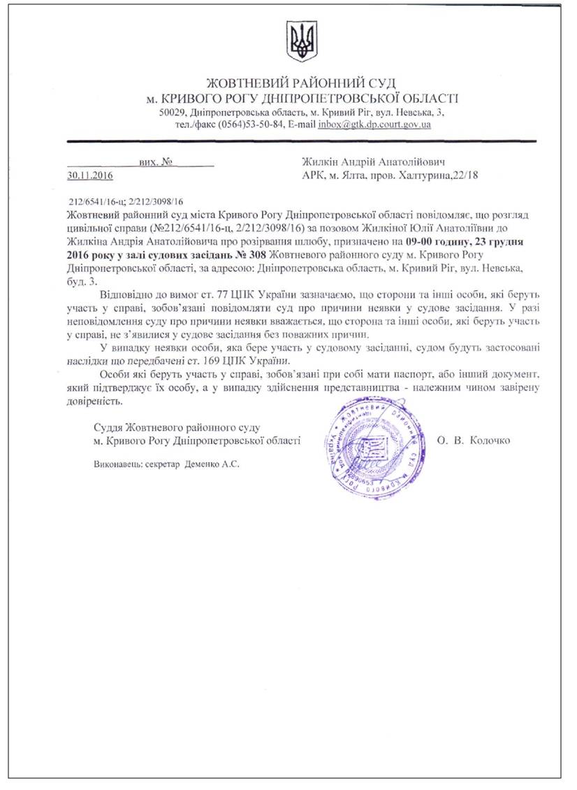 30.11.2016 Повідомлення про призначення розгляду цивільної справи за позовом Жилкіної Ю.А. до Жилкіна А.А.