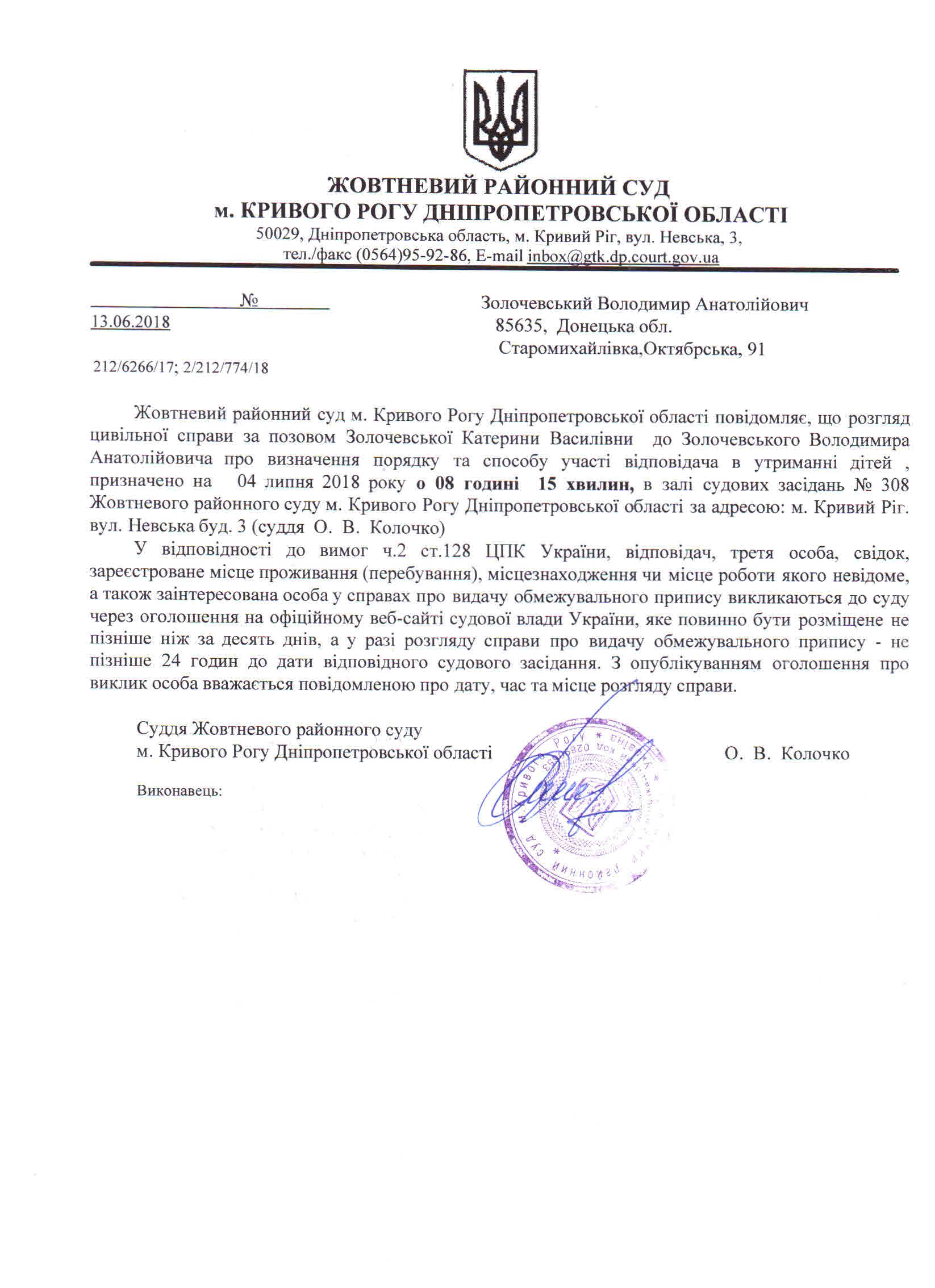 Повідомлення про розгляд цивільної справи за позовом Золочевської Катерини Василівни до Золочевського Володимира Анатолійовича про розірвання шлюбу