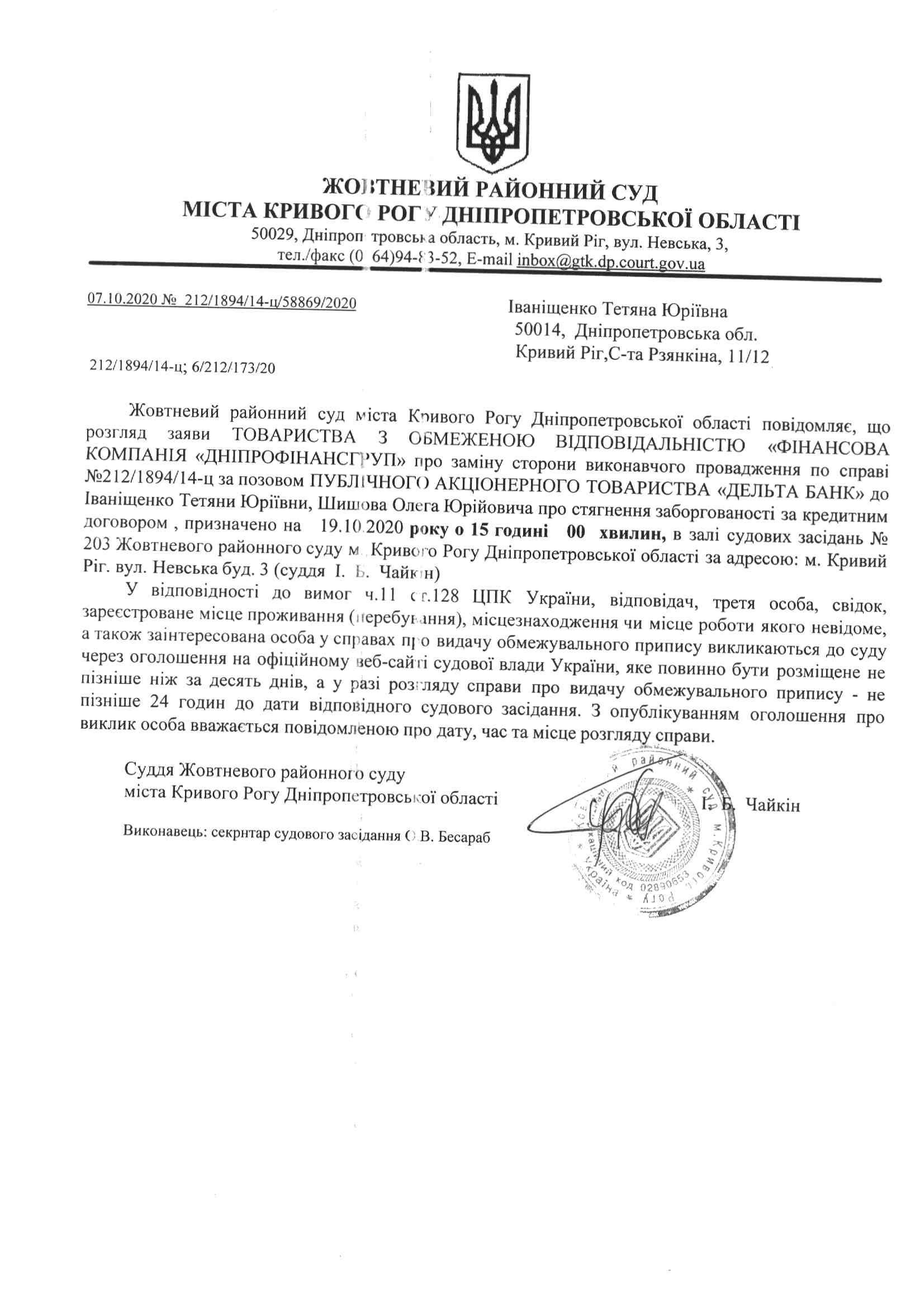 Оголошення про виклик до суду Іваніщенко Тетяна Юріївна