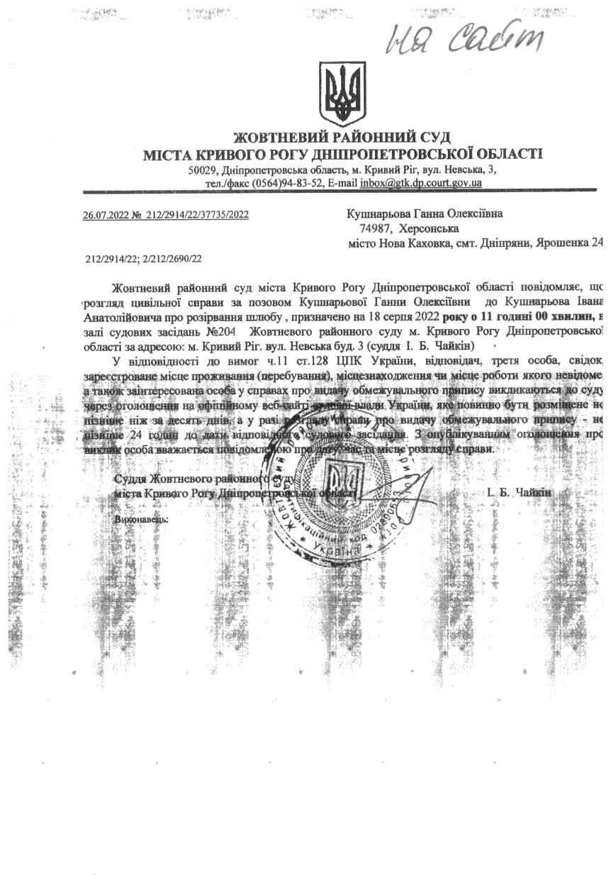 Оголошення про виклик до суду Кушнарьової Ганни Олексіївни