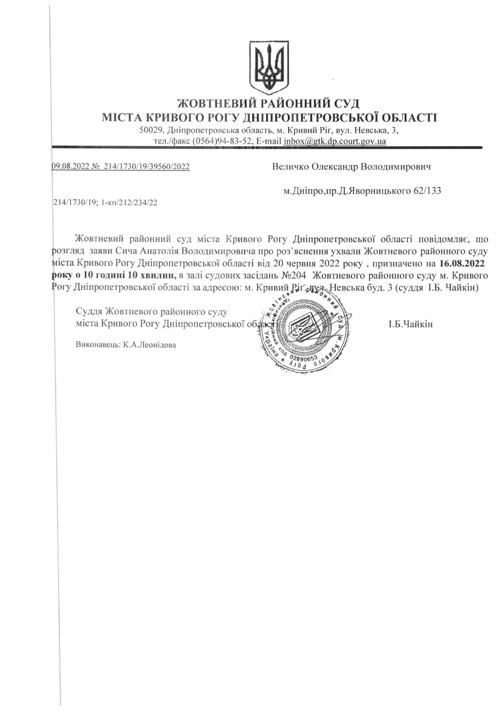 Оголошення про виклик до суду Величко Олександра Володимировича