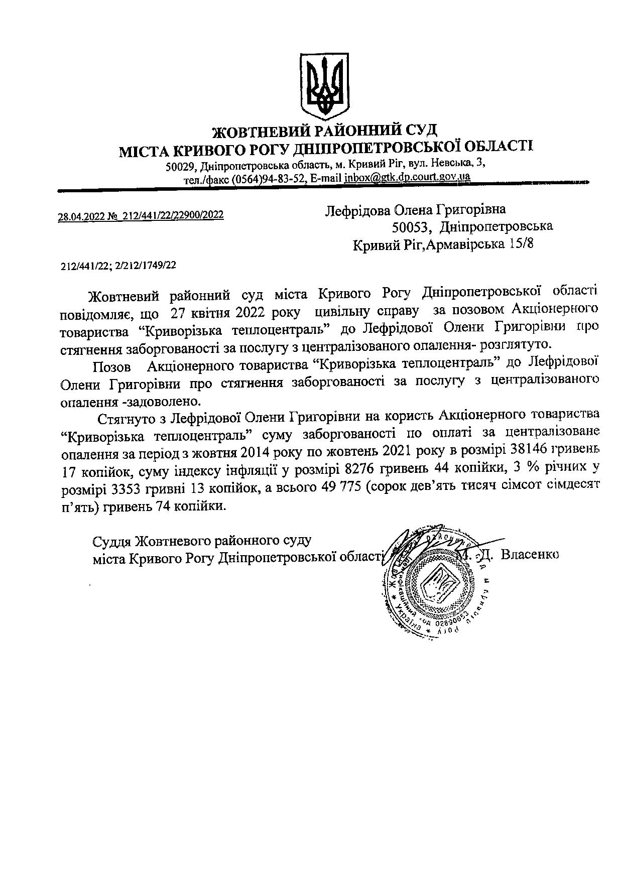 Повідомлення про розгляд цивільної справи за позовом Акціонерного товариства "Криворізька теплоцентраль" до Лефрідової Олени Григорівни про стягнення заборгованості за послугу з централізованого опалення