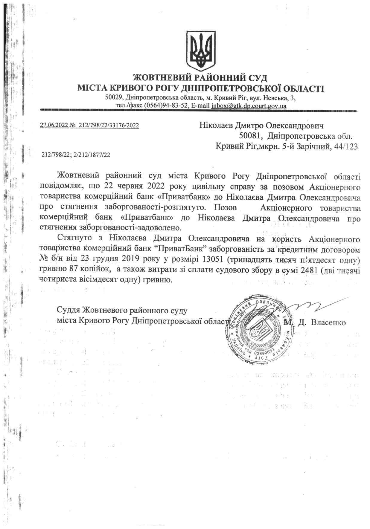 Повідомлення про розгляд цивільної справи за позовом акціонерного товариства комерційний банк "ПриватБанк" до Ніколаєва Дмитра Олександровича про стягнення заборгованості