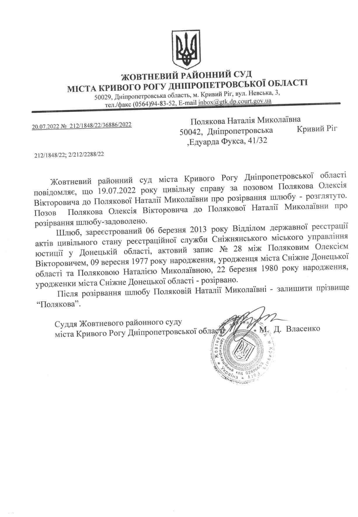 Повідомлення про розгляд цивільної справи за позовом Полякова О.В. до Полякової Н.М.