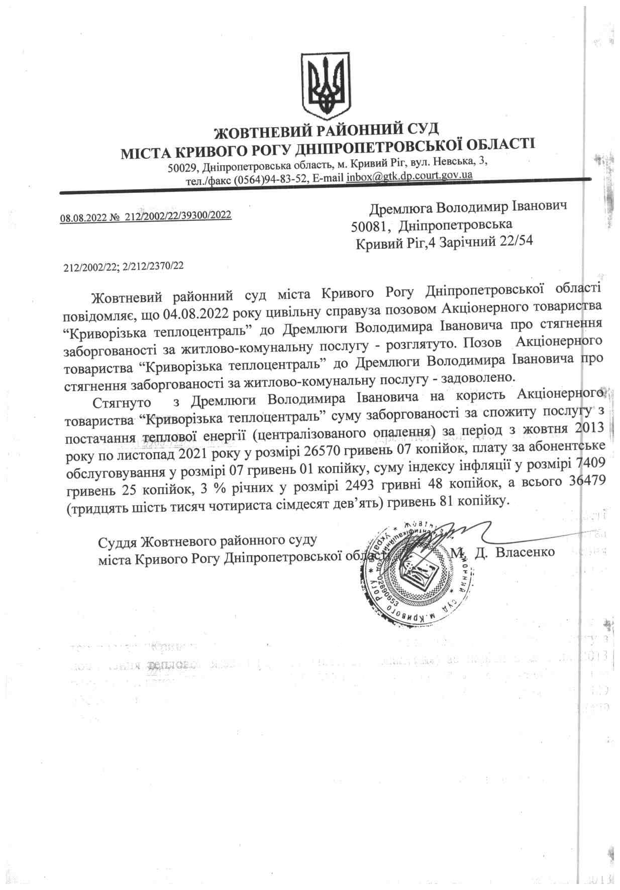 Повідомлення про розгляд цивільної справи за позовом акціонерного товариства "Криворізька теплоцентраль" до Дремлюги Володимира Івановича про стягнення заборгованості