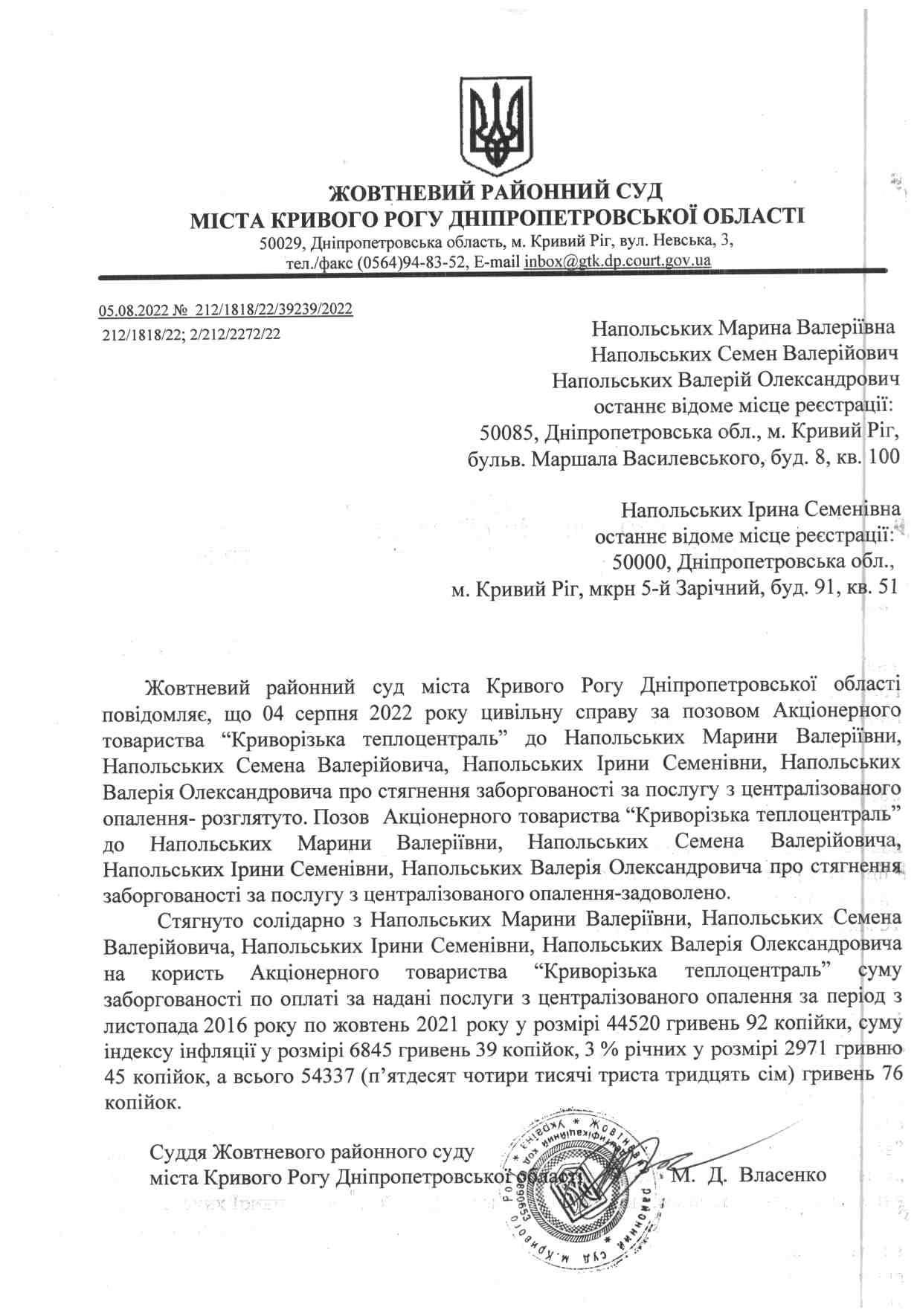 Повідомлення про розгляд цивільної справи за позовом АТ “Криворізька теплоцентраль” до Напольських М. В., Напольських С. В., Напольських І. С., Напольських В. О. про стягнення заборгованості за послугу з централізованого опалення