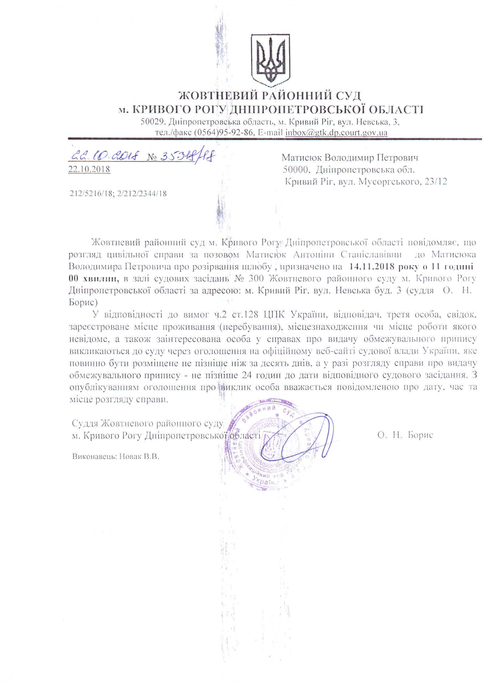 Оголошення про виклик до суду Матисюк Володимир Петрович